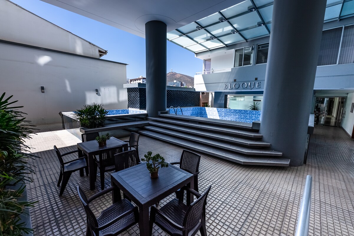 IN THE BEST AREA OF COCHABAMBA has it all! Comfortable Hotel quality white pillows, sheets, blankets, the fastest internet available, well equipped kitchen, 2 tvs with channels from all around the world, laundry room, clean and disinfected kitchen, bedroom and bathroom. Stainless appliances. And the Condominium has full amenities such as Tempered pool, cafeteria, large patio,Store, 360 view of Cochabamba, taxi service, security 24/7. It is 10 min away from the most visited places in town!