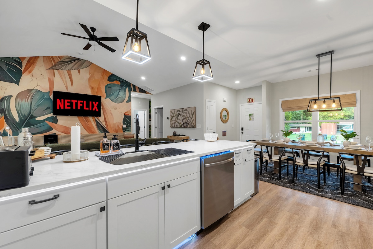 El Palm Oasis Retreat se encuentra a pocos minutos de Ft. Benning y la zona del centro de Columbus. Esta propiedad tiene grandes palmeras de hoja perenne que te harán sentir como si estuvieras en tu propia isla. La propiedad ha sido renovada para un elegante refugio de inspiración moderna. Dos spa como duchas a ras de suelo. Casa de tres dormitorios y dos baños que crea un entorno relajado para tu estancia y la de tu familia. Un montón de servicios para ti y los miembros de tu familia. La bata y las zapatillas de Versace no están disponibles para los huéspedes.