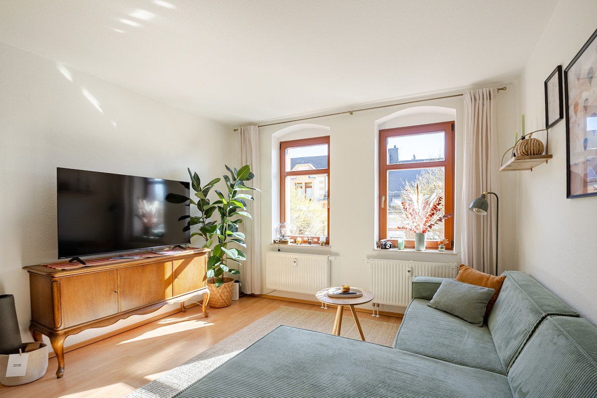 Vivir con encanto de fábrica al pie del Kaßberg de Chemnitz, un encantador barrio de la época de los fundadores. Vives en un acogedor apartamento cerrado (aprox. 50 m²) bajo el techo. Espacio para hasta cuatro personas (dos en la cama doble del dormitorio, dos en el sofá cama de 1,40 m del salón). Incl. wifi. Todo está amueblado con mucho amor y sentido del detalle - siéntete como en casa. Ya sea un viaje corto o una estancia más larga, el equipamiento está disponible.