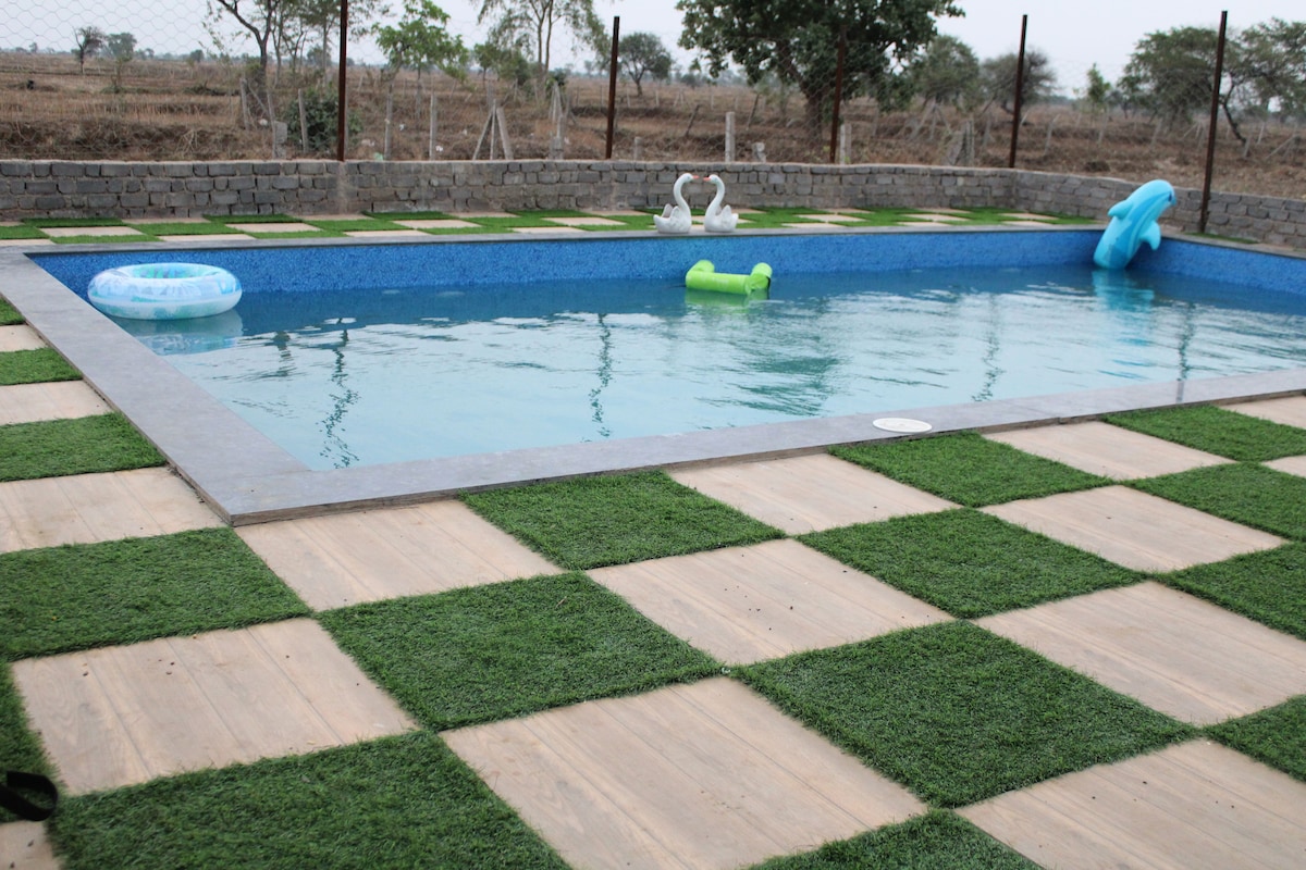 Sri Tulasi Eco Farm Stay es una hermosa granja orgánica de alrededor de 2 acres, y esta casa de madera con piscina privada de agua dulce con vistas perfectas al río hace que tu estancia sea súper memorable. Cama tamaño king de lujo súper cómoda, enorme balcón y todo esto en el regazo de la naturaleza. Un lado tienes vistas al río, el otro lado tiene vistas al césped. Cuando se trata de actividades, juega al bádminton descalzo, date un chapuzón en nuestra piscina de agua dulce o simplemente baño en el río Saradha, cricket neto, pesca y jardinería.