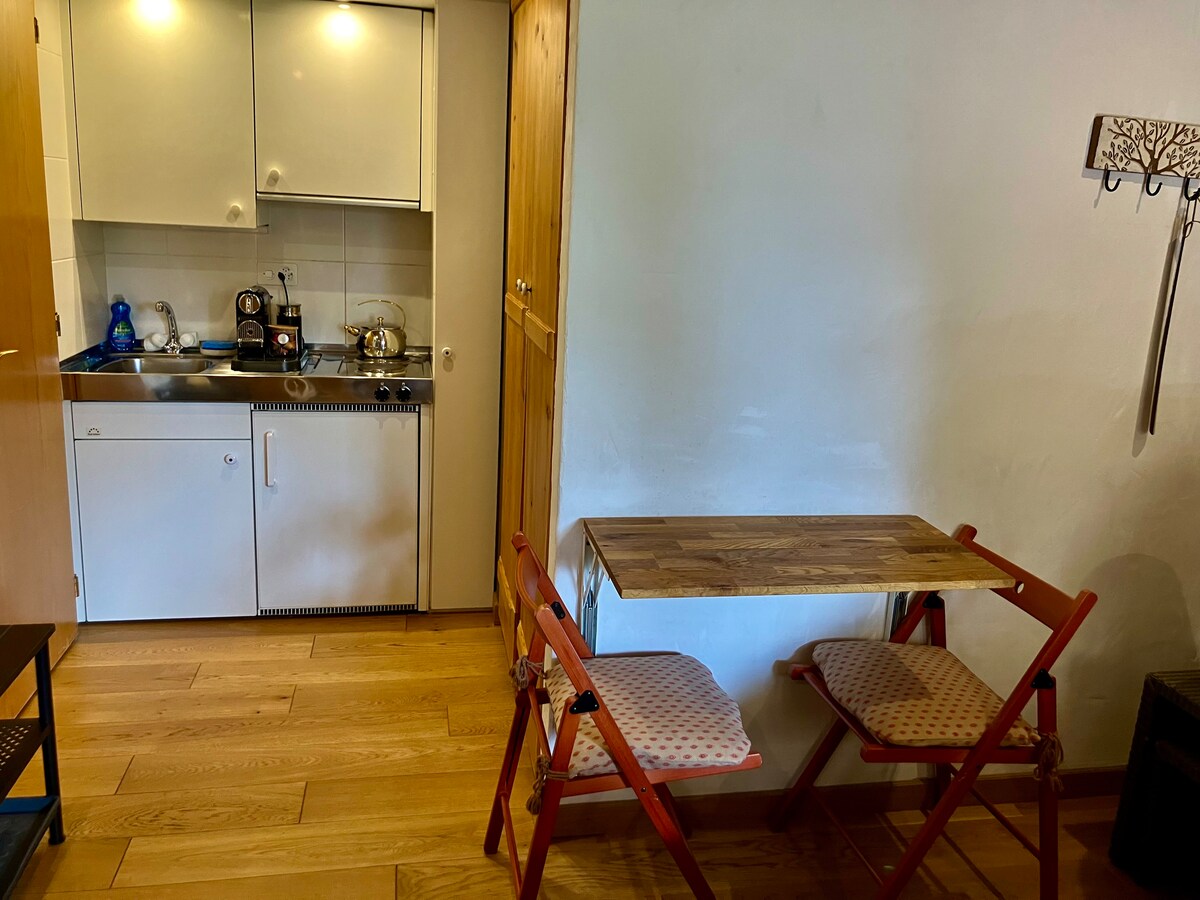 Acogedor estudio (21 metros cuadrados) cerca del centro de la encantadora Crans-Montana, a 10 minutos a pie de las pistas de esquí, junto al lago Moubra y frente al campo de golf (esquí de fondo en invierno). ¡Para una estancia de 7 días o más, ofrezco desayuno!