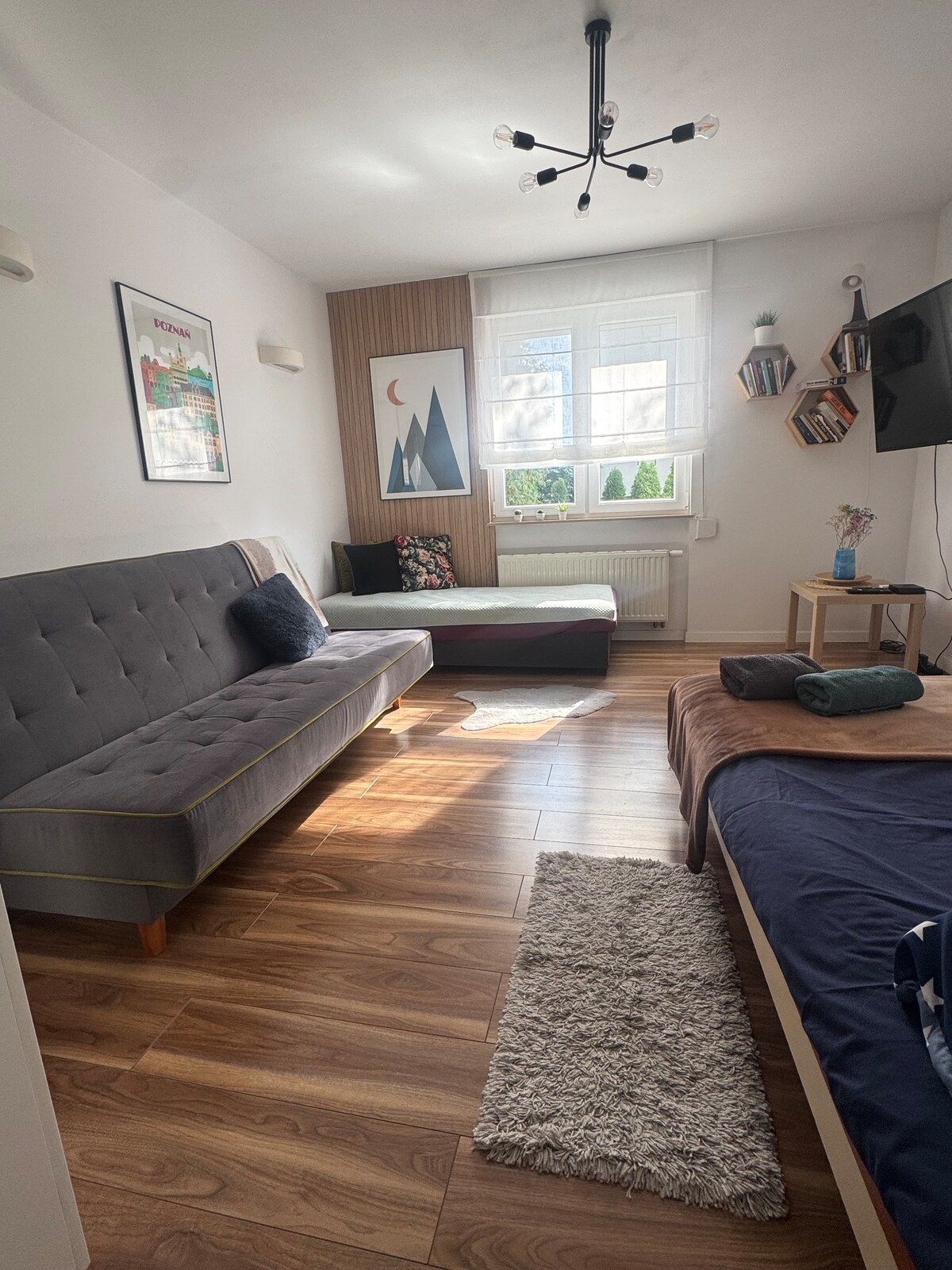Apartamento de 2 habitaciones con acceso al jardín - Toallas y artículos de higiene personal incluidos en el precio de la estancia. - estacionamiento gratuito, cerrado - Cocina totalmente equipada. - La posibilidad de comer en el jardín. - Barbacoa - parque infantil - mesa de ping-pong - lugares para relajarse en una hamaca y en mecedoras en el agradable resplandor de las velas - Jardín cerrado, amigable para niños y perros. - Tienda Żabka a unos 100 metros de distancia. - A 6 km del centro de la ciudad. - 1,8 km del estadio Lech.