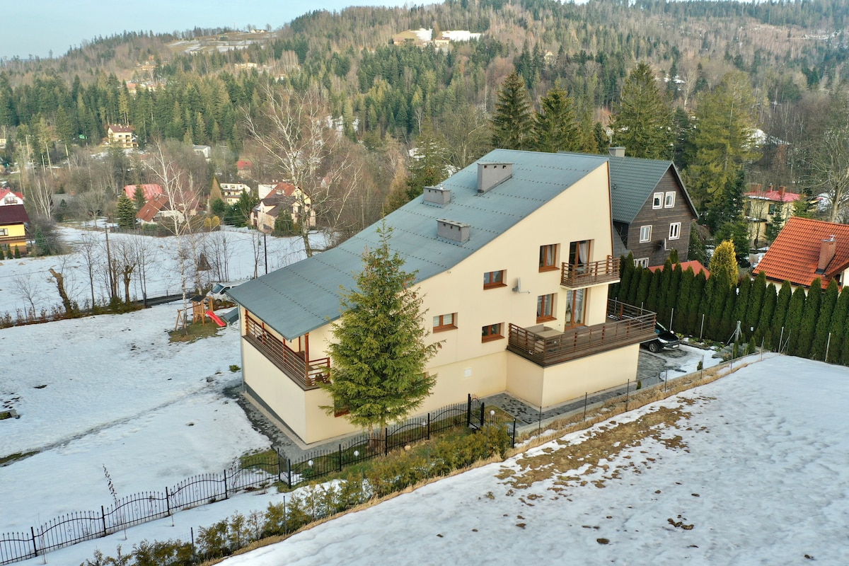 Una cabaña con vistas en una zona tranquila con hermosas vistas a las montañas proporcionará a todos unas vacaciones de ensueño. Toda la casa está disponible para uso exclusivo. La casa tiene capacidad para un máximo de 16 personas. Gracias a la sala de juegos bien equipada, incluso con mal tiempo, ningún huésped, ya sea pequeño o grande, se aburrirá. La chimenea en el salón y la hoguera en el exterior proporcionarán un ambiente único de descanso en la montaña.