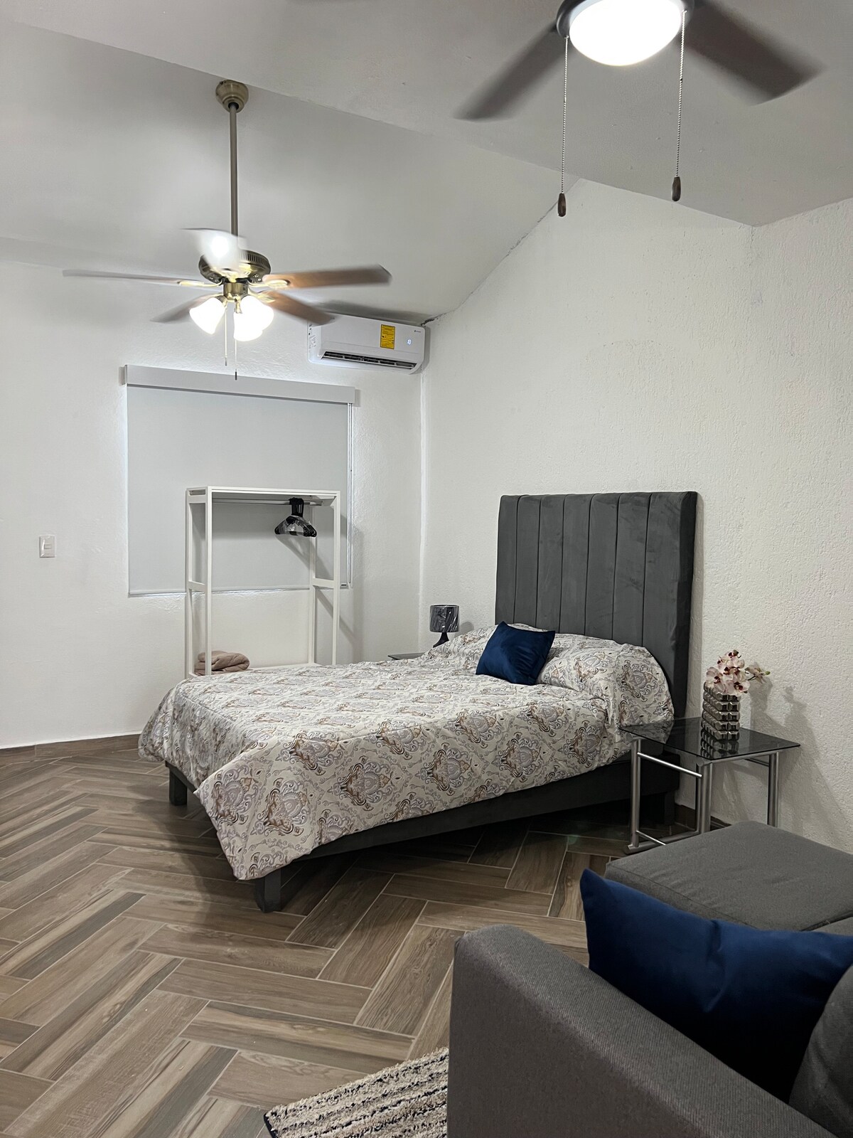 Habitación con entrada independiente en fraccionamiento privado, excelente opción si requieres estar cerca del aeropuerto ya que solo está a 10 min., 10 min de restaurantes y 15 min de plazas comerciales. Muy cerca de diferentes zonas industriales, ideal para viajes de negocios, vacacionar o simplemente relajarse. Cuenta con baño privado, clima para tu mayor comodidad. Es una zona y fraccionamiento muy tranquilo y seguro.