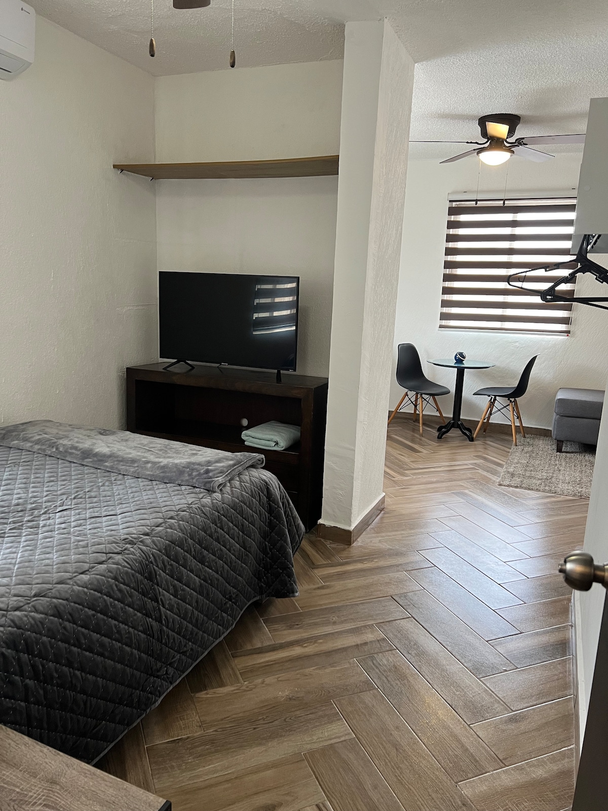 Bonito mini departamento en colonia antigua y popular a tan solo 15 minutos del aeropuerto con fácil acceso a los principales centros comerciales de la zona. Estarás situado a solo 20 minutos del centro de Monterrey. Contamos con cochera particular para un vehículo XL y estacionamiento en el exterior. Departamento climatizado, baño completo con agua fría y caliente. Smart TV con 55” y canales premium. Todo lo necesario para pasar un día cómodo, discreto y tranquilo. ¡Siéntete en casa!