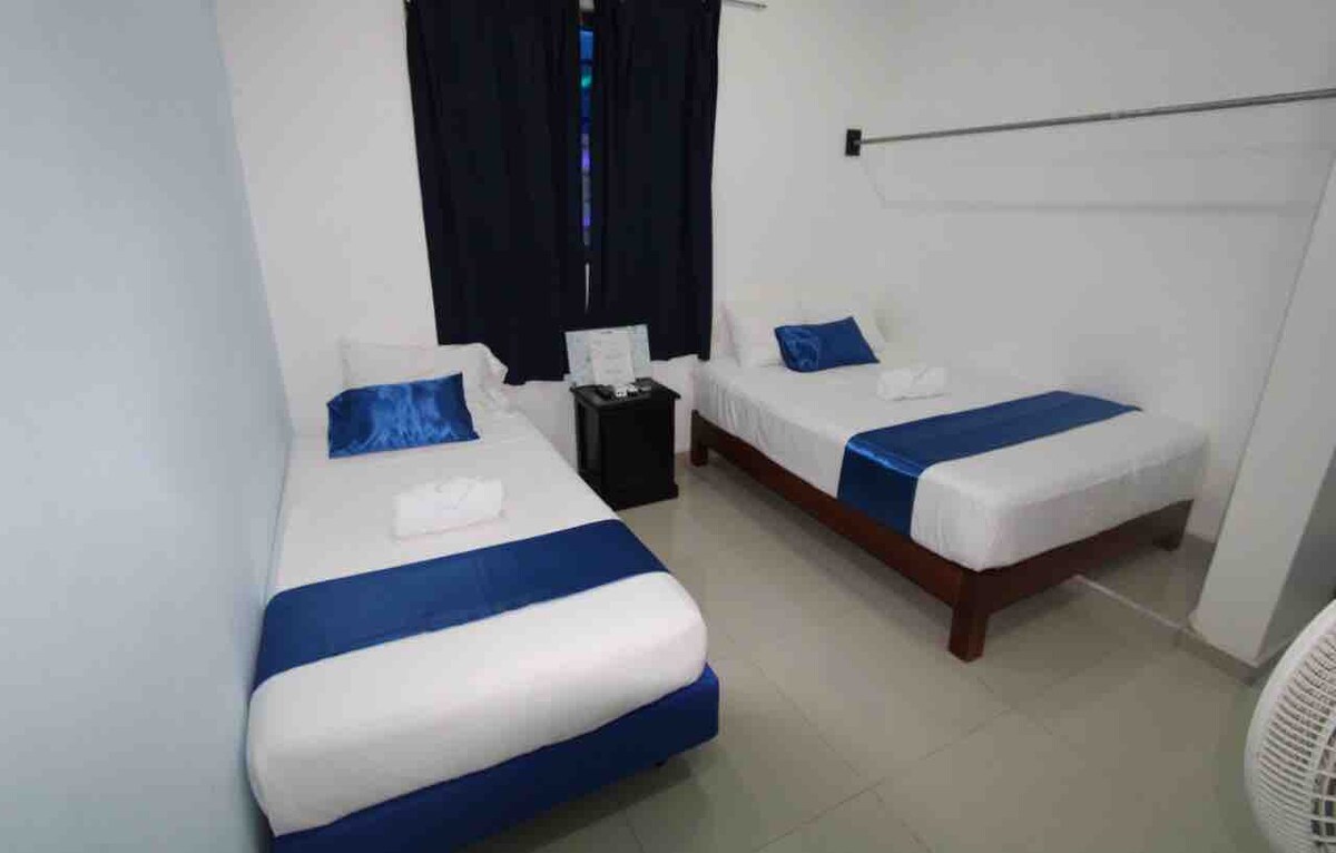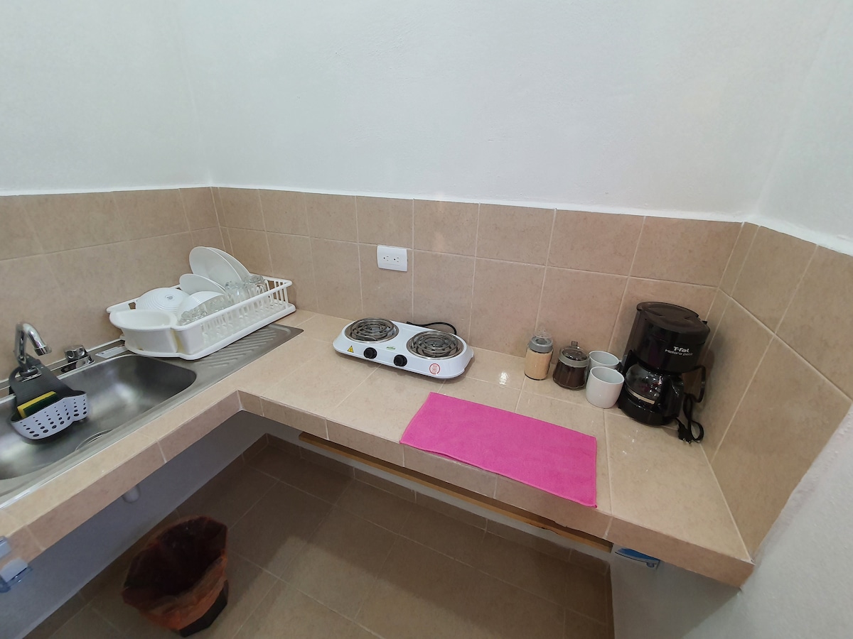 Suite perfecta para 2 personas con cama Queen, equipada con todos los servicios como: Smart TV con Netflix, Wifi, Cable, Aire Acondicionado, Agua caliente, Cocineta con Frigobar, Parrilla Eléctrica, Microondas, Licuadora, Cafetera, Utensilios de cocina, Platos, Cubiertos, etc. Ubicada en el Centro Histórico de Ciudad del Carmen, a 3 cuadras de la Iglesia del Carmen, 3 cuadras del Malecón, a 2 kms de Playa Norte y del Malecón Costero cerca de bancos y restaurantes.