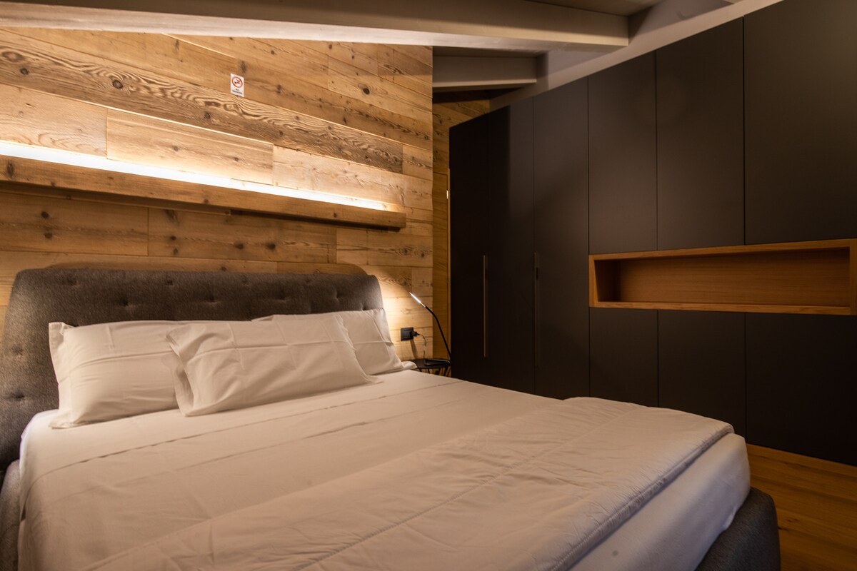 El ático consta de un espacio abierto con techos muy altos y dos habitaciones en el tejado. Es luminosa, extremadamente acogedora, gracias también al hermoso suelo de madera clara, y agradable en todas las estaciones: en primavera y verano por la cálida luz exterior, filtrada por las ventanas del techo y el balcón; en la estación fría por la encantadora chimenea con fuego a la vista y las vistas a los prados nevados.