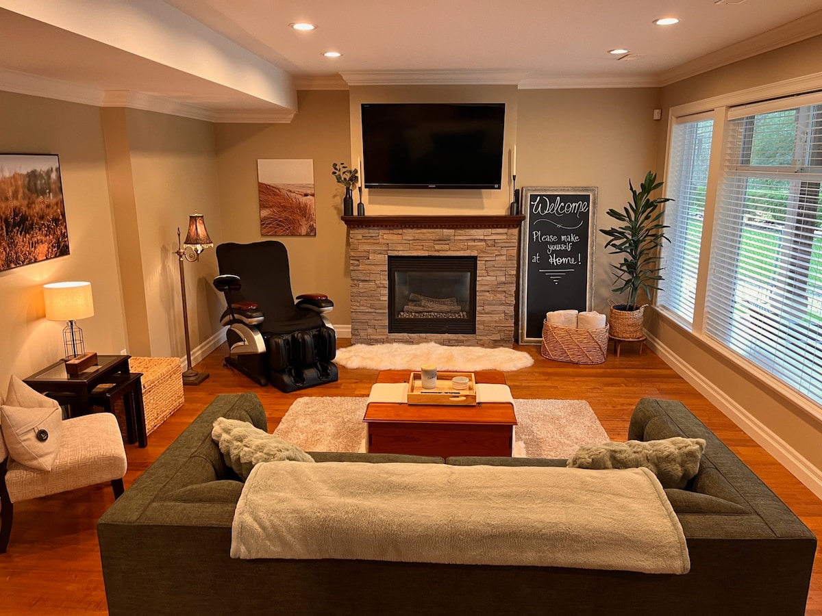 ¡Disfruta de la privacidad y el fácil acceso a esta acogedora suite en el sótano de 1 dormitorio (más cama extraíble tamaño queen), en el hermoso vecindario, de West Cloverdale! Volviendo al espacio verde y a solo unos pasos de distancia, hay hermosos senderos y Bose Park. Después de un largo día, ¡puedes relajarte junto al fuego y relajarte en el sillón de masaje! Hay mucho estacionamiento en la calle disponible y todas las necesidades comerciales a 5 minutos en auto o menos. Estamos situados cerca de la autopista 10, la autopista 1 y la frontera del Arco de la Paz. ¡Disfruta de tu estadía!