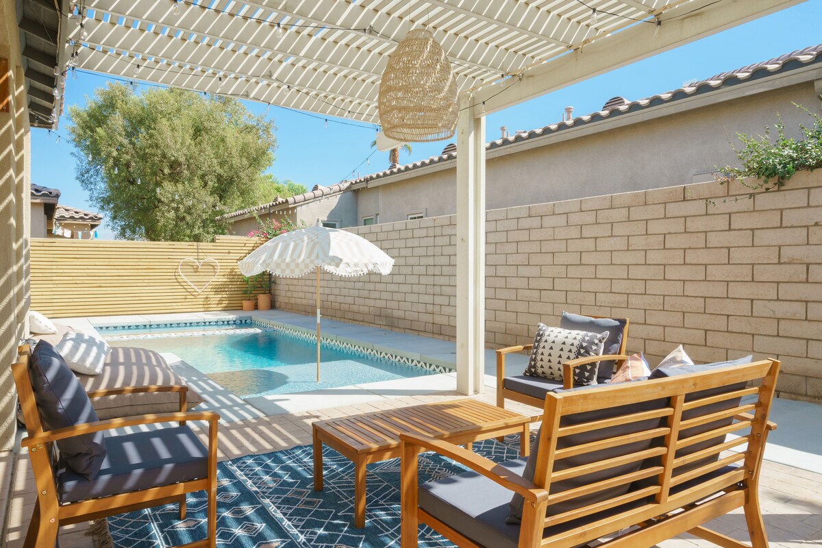 Bungalow Bliss es el refugio perfecto en el desierto para una escapada de fin de semana o a una estancia. Diseñado y decorado profesionalmente, el lujoso interior cuenta con carpintería personalizada y murales pintados a mano. Ubicado en el campo de golf, disfruta de las vistas a la montaña y al campo de golf mientras te relajas en una piscina privada de agua salada climatizada y spa. Disfruta de 1 Gig WiFi y un cargador ChargePoint EV de 50 amperios. Camina a Coachella / Stagecoach, a 10 minutos en auto de La Quinta, a 15 minutos de Indian Wells, a 30 minutos de Palm Springs, a 45 minutos de Joshua Tree