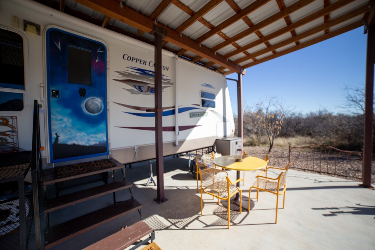Una escapada espaciosa enclavada en medio de árboles del desierto con vistas a la impresionante cordillera de Dragoon Mountain. Salón, cocina, comedor, baño y dormitorio. El patio techado de 12 pies por 32 pies permite vivir en el interior y en el exterior. Los únicos sonidos que probablemente escuches son los del coyote y otros amigos del desierto. Hay un telescopio disponible para ver los increíbles cielos nocturnos. También contamos con un pozo de fuego en el suelo para asar nubes de azúcar y disfrutar de las montañas por la noche.