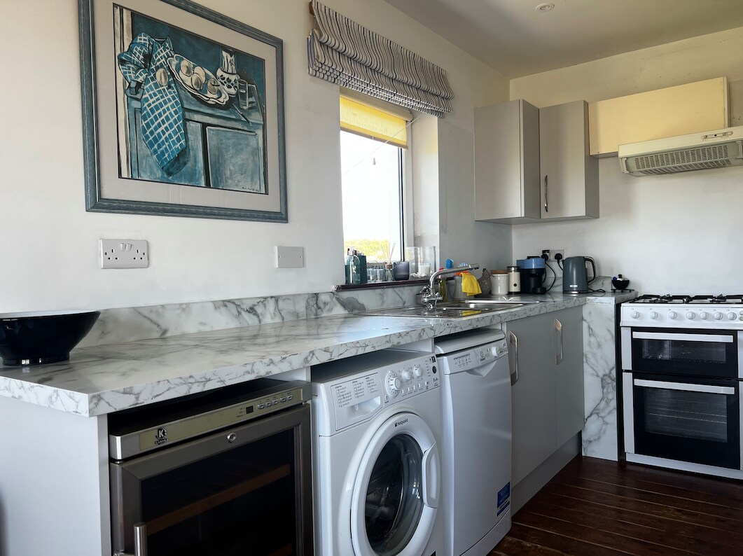 La casa flotante está justo sobre la playa (perfectamente segura para los niños) en la isla de Valentia, frente a la costa suroeste de Irlanda. El gran ventanal de la sala de estar tiene vistas a la playa, el faro, la isla Beginish y más allá. Es el lugar más maravilloso para estar en buen tiempo y el más fascinante en mal tiempo cuando puedes ver grandes olas rompiendo en la playa, la costa escarpada y las rocas junto al faro, ¡todo mientras te acurrucan en el sillón y una taza de té caliente!