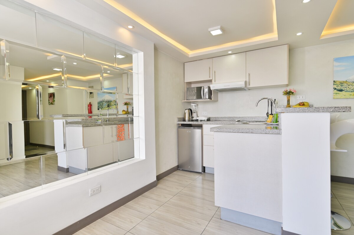 Suite located in the Mariscal area, on the fifth floor of the Monarch building that has a security guard. Due to the location it has a beautiful view of the mountains (see photos).The suite is private, has Wi-Fi, television LG, a king size bed, two sofa beds, a private bathroom with hot water, balcony and fully equipped kitchen. The suite keys will be delivered with a tag for principal entry. Aditional has a internal parking. Welcome to Quito and enjoy your stay in the best area of the capital.