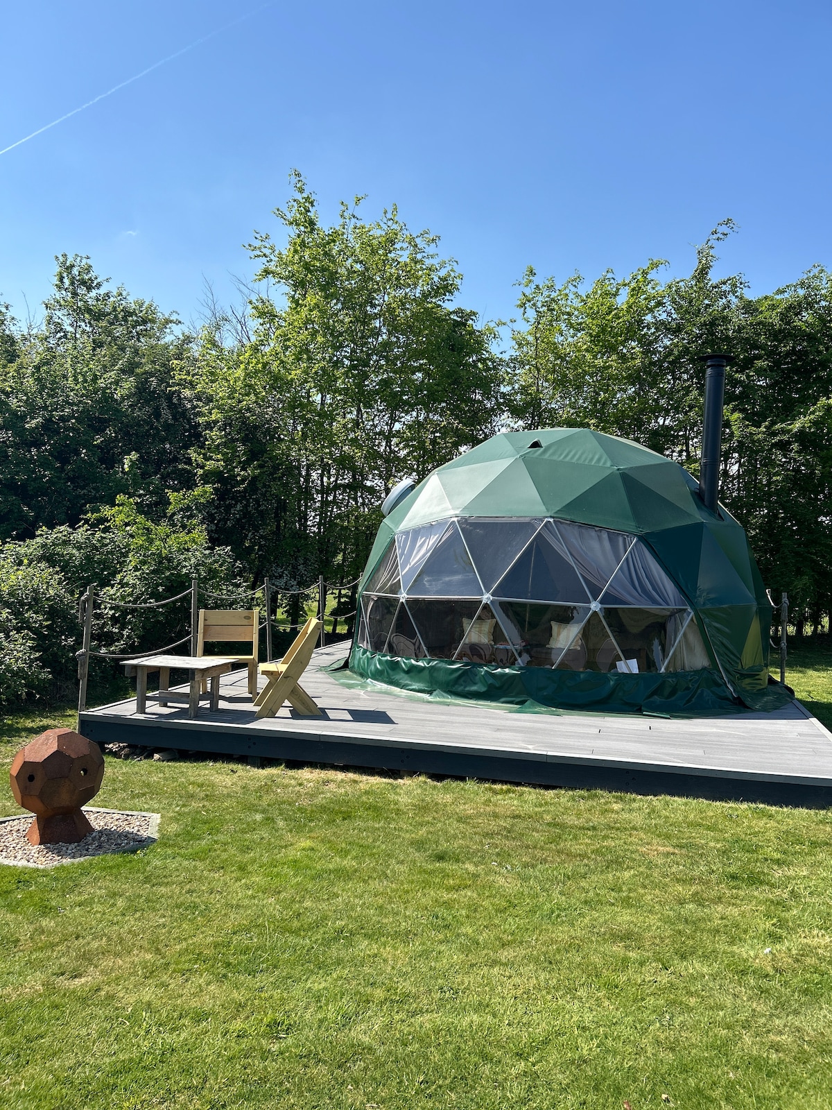 El Woodland Zeppelin (baño al aire libre disponible de abril a noviembre) Este romántico lugar en la naturaleza forma parte de un bosque de sesenta y cinco acres. Nuestro Zeppelin aterrizó en 2017 y desde entonces ha sido un refugio popular para alejarse de la rutina. El Zeppelin del bosque se encuentra cerca de nuestro alquiler original, Airship 001, pero está diseñado de manera diferente en el interior para atraer a todas las parejas y a aquellos que han disfrutado de sus estancias con nosotros, anteriormente. Este alojamiento no tiene enchufes de red y la señal móvil es escasa.