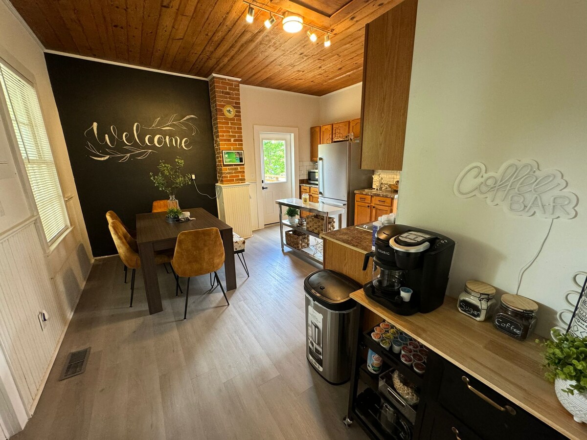 ¡Cerca de la I-70 y del sendero! Tu casa de campo está a unos pasos del sendero y a 3 manzanas de restaurantes, tiendas y galerías del centro de la ciudad. ¡Alójate cómodamente en 2 dormitorios, con sofá cama tamaño queen de espuma viscoelástica, 1,5 baños, garaje, terraza, salón temático de los años 20 con puerta oculta y mucho más aquí en el histórico Rocheport! TV, wifi y barra de sonido Bluetooth y un gran patio trasero con iglú de jardín disponible para tu entretenimiento. Estancias de una noche disponibles bajo petición.