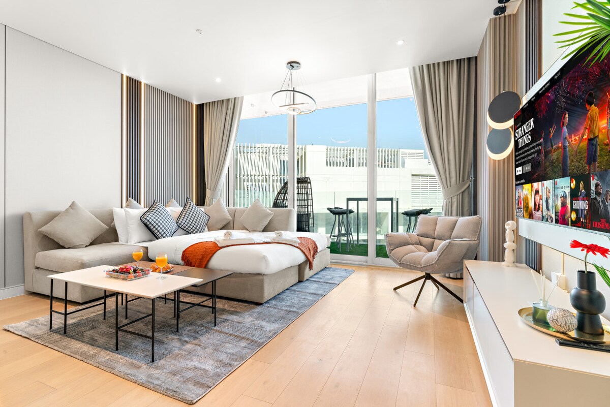 ¡Te damos la bienvenida a ROAM INNS! Moderno estudio frente al mar en Al Hadeel, Al Raha Beach, a pocos pasos de Yas Bay Waterfront. A solo 10 minutos de las atracciones de Yas Island: Etihad Arena, Ferrari World, Warner Bros, Yas Waterworld, SeaWorld y Yas Marina Circuit. Disfruta de piscina, gimnasio, estacionamiento seguro y fácil acceso al centro y al aeropuerto. Perfecto para 2 personas, nuestro apartamento remodelado ofrece toques contemporáneos y todas las comodidades que necesitas para una estancia encantadora. Es fácil en esta escapada única y tranquila.