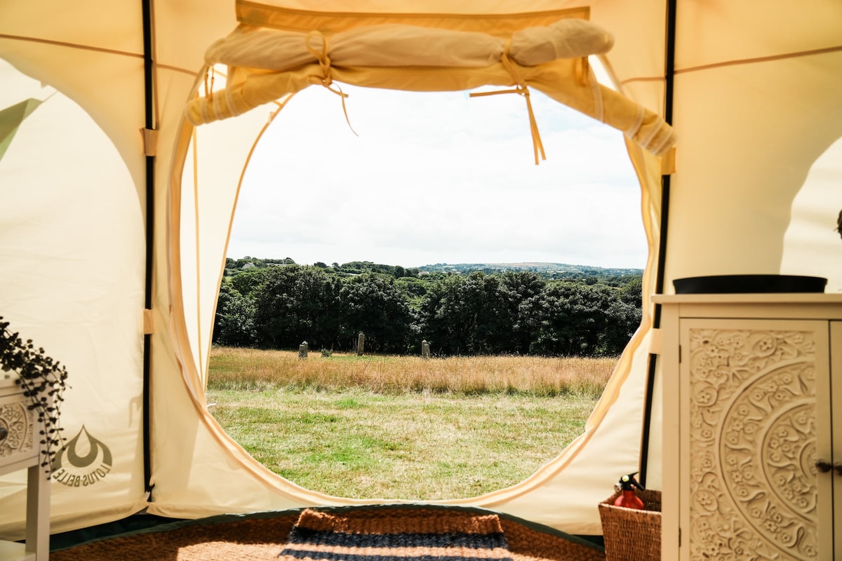 ¡Una habitación de hotel de lujo en una tienda de campaña con un campo solo para ti! Fabuloso Lotus Bell en un exclusivo campo privado con impresionantes vistas al campo, árboles, prados y siluetas de minas de hojalata. A 10 minutos en coche de las populares playas de surf/natación. Ideal para parejas y familias. Tiene capacidad para 2 a 4 personas en king/sgl. LAS COMODIDADES DEL HOGAR incluyen wifi gratuito/mininevera USB, hervidor de agua, té, café y azúcar. Sillas, 2 tumbonas, mesa de picnic, barbacoa/fogata, estufa/parrilla de campamento, ollas/sartenes/platos, cuchillos y cubiertos. Los perros pueden deambular libremente. ¡Un lugar verdaderamente idílico!