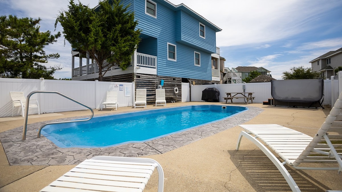 La reluciente y renovada casa de playa de 4 dormitorios y 3 baños es una casa del árbol de 2500 pies cuadrados que cobra vida con 6 cubiertas, cocina de chef con diseño de planta abierta y techos de 20 pies, piscina privada (opción de calefacción) con barbacoa de gas, porche cerrado y jacuzzi superior para contemplar las estrellas. Baño tipo spa con bañera de inmersión y chimenea. Las impresionantes playas y el pintoresco muelle del atardecer están a solo un corto paseo a pie o en bicicleta. Convenientemente ubicado a pocos minutos de tiendas, restaurantes y atracciones, al tiempo que conserva la soledad de Corolla.