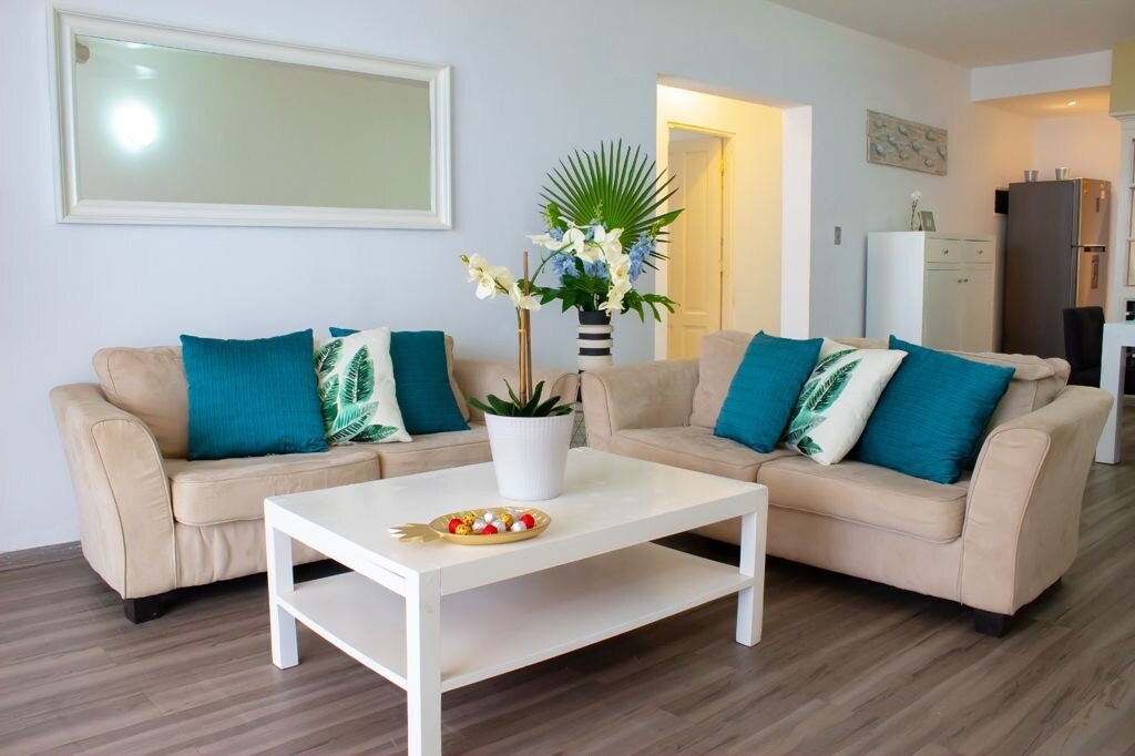 Acojedor apartamento para 6 personas, 3rd Piso wifi gratis, AC y electricidad incluida. Cuarto amplio con cama confortable, baño y armario privado. 2do Cuarto cama individual y litera para jovenes o niños. Moderna y Amplia Sala, Smart TV y comodo sofá. Cocina totalmente equipada con todos utensilios y vajilla. Moderna mesa y sillas de comedor . Lavadora/secadora disponible. El edificio cuenta con 2 piscinas. La Terraza en la 4ta planta con barbacoa, sillones y la mejor puesta de sol.