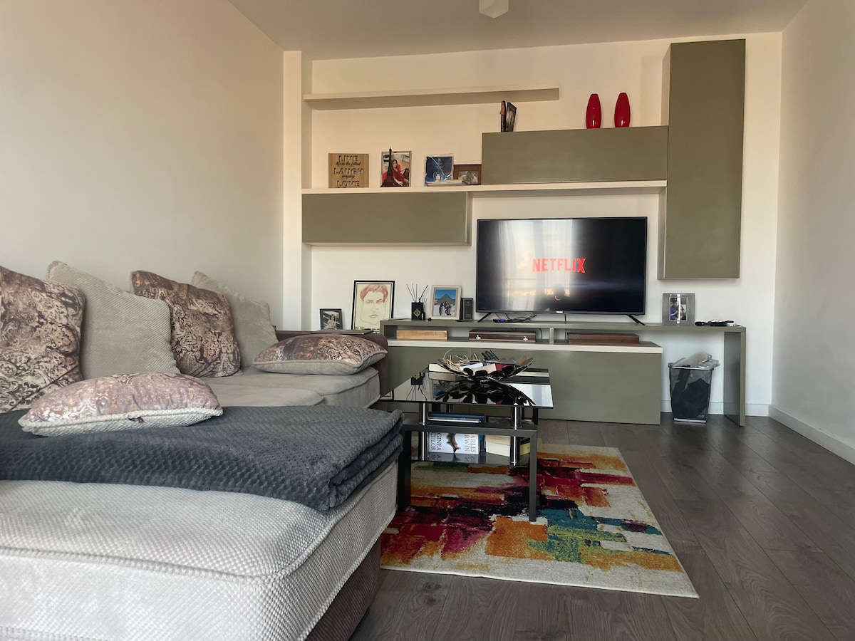 ¡Con vistas a la ciudad de Craiova en este departamento único, moderno y tranquilo con las mejores vistas y acceso a nuestra gran terraza en la parte superior del edificio! Está ubicado en una calle tranquila entre el centro de la ciudad y el centro comercial Promenada. Hay estacionamiento privado gratuito disponible. La estación pública está al otro lado de la calle. El mercado navideño está a solo 15 minutos a pie o a 5 minutos en auto. La sala de estar está equipada con un sofá cama grande y cómodo, por lo que podemos alojar hasta cuatro huéspedes.