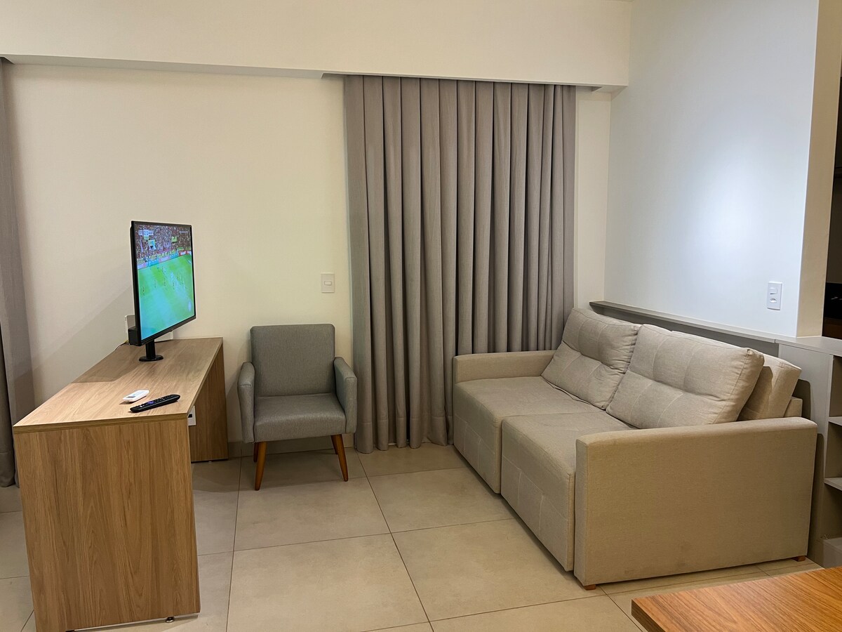 Relájese en este lugar único y tranquilo. Estudio completo con wifi, smart TV, aire acondicionado, Alexa, utensilios de cocina, cafetera, filtro de agua, secador de pelo, plancha y todo lo necesario para su comodidad. Puedes elegir entre 2 camas individuales o 1 cama queen. Disfrute de las áreas comunes como piscina, ascensor, estacionamiento, lavandería, conserjería 24 horas, sala de estudio o reuniones y espacio gourmet. Excelente ubicación, cerca del Hospital São Francisco y Faculdade UNAERP.