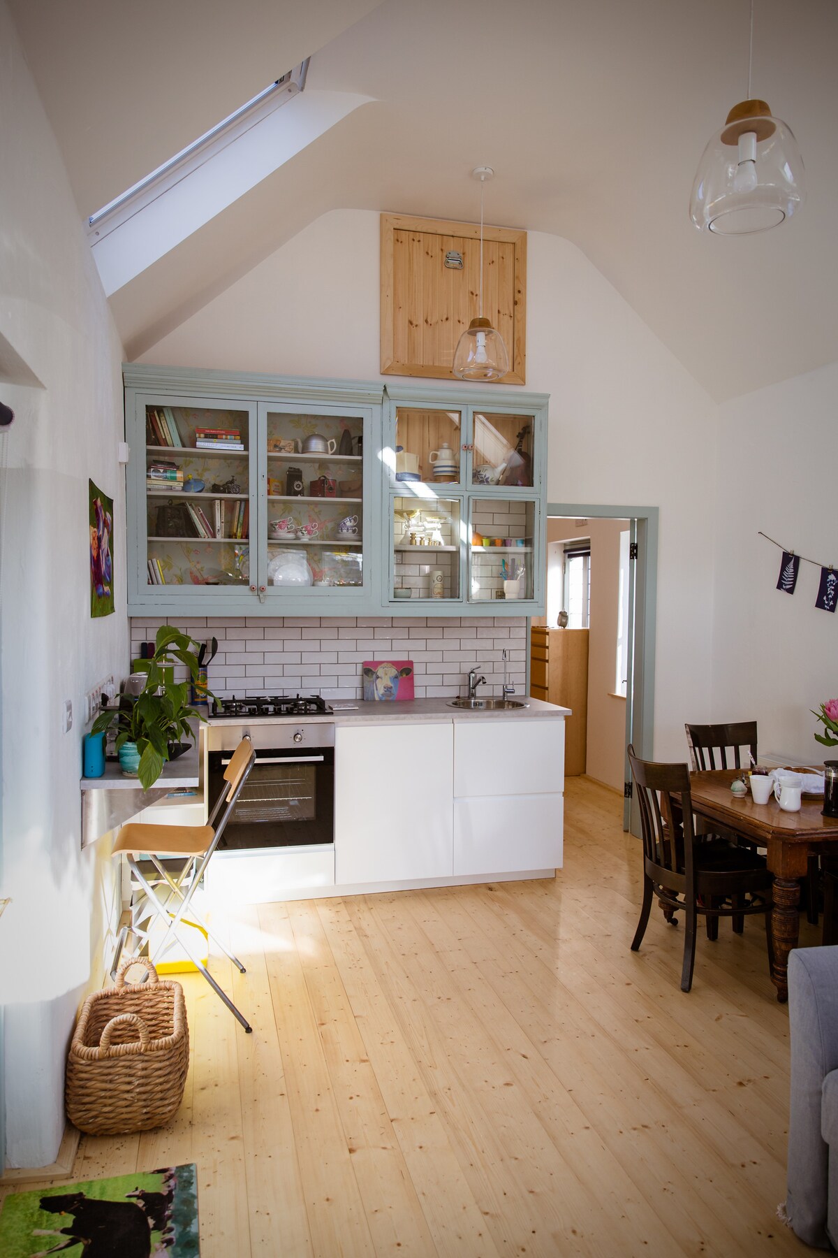 Moderno apartamento de 1 dormitorio en un garaje reconvertido. Ubicado en una zona rural tranquila y pintoresca. El dormitorio de arriba tiene dos camas individuales, tocador y perchero. En la planta baja hay una elegante sala de estar con TV de pantalla plana inteligente. El sofá de la esquina tiene reposacabezas ajustables y se convierte en una cama doble con un práctico almacenamiento de ropa de cama debajo. Cuenta con una cocina americana totalmente equipada y un baño con ducha termostática.