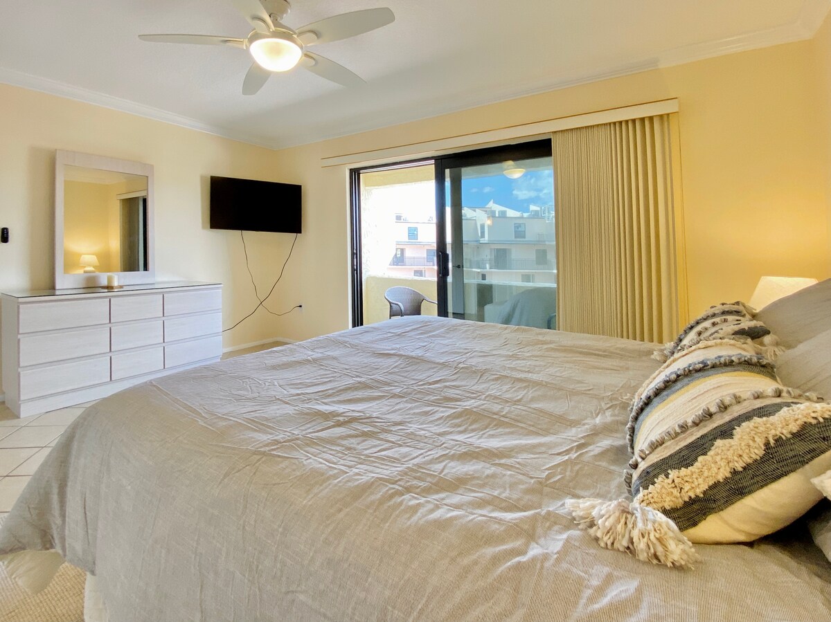 ¡Condominio elegante y casual totalmente remodelado en 2025, y muy cerca de la playa! Un dormitorio, una unidad de baño incluye encimeras de cocina de cuarzo, electrodomésticos nuevos, cama tamaño king y patio relajante. ¡Tamaño perfecto para 2 huéspedes! No hay necesidad de cruzar carreteras concurridas para llegar a la impresionante arena blanca; a solo 5-10 minutos a pie a lo largo de exuberantes terrenos que cuentan con 3 piscinas climatizadas. Se proporciona equipo de playa y la unidad está equipada con sábanas y utensilios de cocina. A pocos minutos de Siesta Village y otros maravillosos restaurantes y actividades.