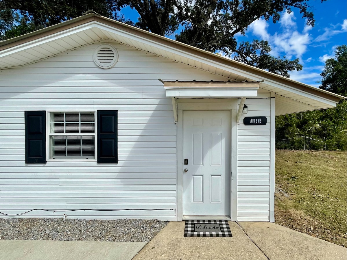 A 30 minutos de Destin FL, votado por sus hermosas playas. La pequeña casa para 4 tiene todas sus necesidades esenciales para una escapada acogedora. Comienza el día tomando tu café por la mañana en la terraza delantera. Coge esas toallas de playa que te proporcionamos... ¡y ve a disfrutar! Porche trasero con patio trasero cercado de forma privada. ACTIVIDADES CERCANAS: zoológico de la Costa Esmeralda, caza, golf, pesca de alquiler, paravelismo, esnórquel, piragüismo, tubing río abajo, senderismo y parques de atracciones.