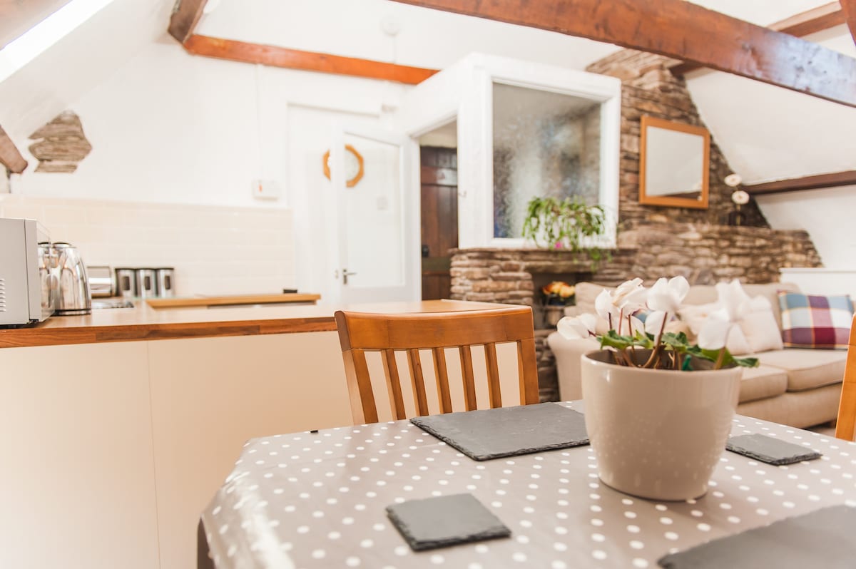 Acogedora suite dúplex recientemente renovada con entrada privada en la parte trasera de una casa histórica con sala de estar, dormitorio arriba, aseo y cuarto de ducha. SIN COCINA pero hay nevera, microondas, tostadora, hervidor de agua y cafetera Nespresso. En 20 acres de terreno con unas vistas impresionantes. Crickhowell High Street está a 10 minutos a pie. Acceso directo a senderos al río Usk desde la propiedad y paseos de montaña a Table Mountain y más allá al otro lado de la carretera. Aparcamiento seguro y almacenamiento de bicicletas.