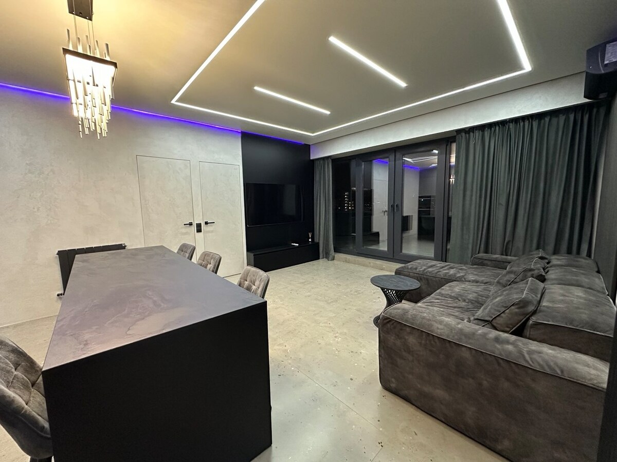 Nuevo, acogedor y moderno apartamento con un techo de 3 metros de altura. TV inteligente, NETFLIX, sistema de altavoces, terraza al aire libre, comedor con ventanas panorámicas. «Este apartamento está diseñado para que te sientas casi como en casa... pero más cómodo». - Svetlana, anfitriona