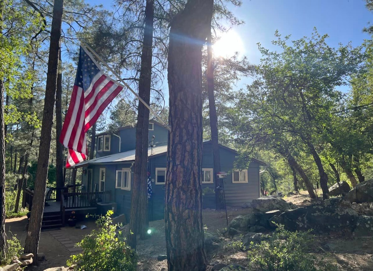 En los pinos - Dos patios al aire libre - Barbacoa de gas - Prescott National Forrest - ¡Aire acondicionado y calefacción! Cocina totalmente equipada - Chimenea - TV INTELIGENTE en la sala de estar y dormitorios - ¡Recién remodelado! Dos habitaciones- -QUEEN con baño en suite y TV inteligente de 43 pulgadas. -(2) Habitación con cama DOBLE con Smart TV. 2 baños completos Con ducha y bañera Sala de estar: TV inteligente grande y streaming: el sofá se saca a la cama tamaño KING Dos terrazas al aire libre con barbacoa de gas y muebles de patio ¡WIFI RÁPIDO!