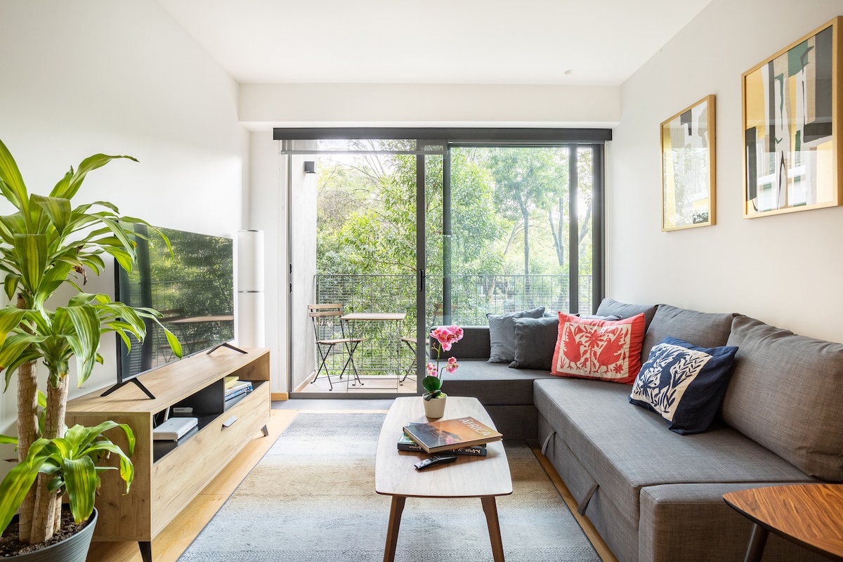 🏡 Depa Taman Condesa (1er piso) 🌿 Balcón arbolado (vista verde) 📶 Wi-Fi rápido (200 Mbps) 🚗 1 estacionamiento 🏊 Carril de nado (reservación en lobby) 💪 Gimnasio 🌇 Roof garden con vista CDMX 💻 Lobby lounge y co-working 🔐 Check-in con código + seguridad 24/7 ☕ Cocina equipada + Nespresso 📺 Smart TV 50” (Netflix/YouTube) 🧾 Facturamos (CFDI) 🛏️ 2 recámaras + 2 baños (principal en suite) 🧺 Lavadora/secadora en el depa 📍 A pasos de Parque México 🌳 Zona tranquila y caminable