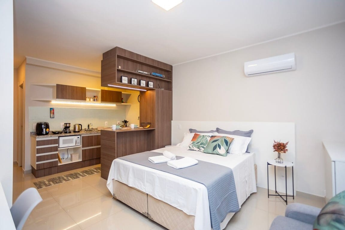 Apartamento en villa con garaje y aire acondicionado, con vistas increíbles al piso 21, estudio en condominio club de alta gama. Zonas comunes con piscina climatizada, gimnasio, coworking, sauna, lavandería, parque infantil y mercado autónomo. 4 personas (1 cama doble y 1 sofá cama), equipado con ropa de cama completa, ducha relajante, cocina planificada con varios electrodomésticos y utensilios, y moderno Smart TV que garantiza entretenimiento.
