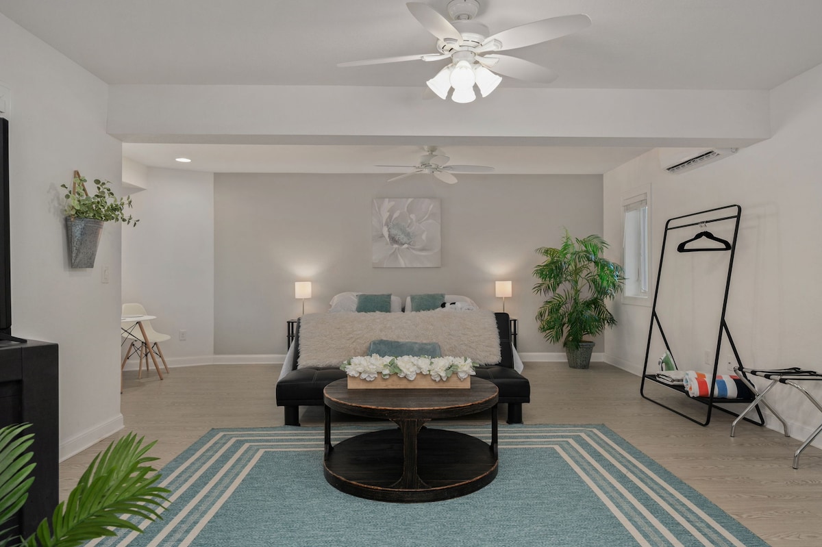 Estudio tranquilo/ventilado con entrada privada a la planta baja y sistema de climatización. En el interior hay una lujosa cama tamaño king, una zona de estar con mesa de centro y un televisor inteligente. Saborea tu café de la mañana en la mesa del bistró o sal por la puerta de entrada privada trasera y disfruta del comedor al aire libre con vistas a la piscina y al campo de golf. Para comenzar el día, puedes caminar hasta la mejor tienda de bagels de la playa. Para el almuerzo, visita la casa club a una cuadra y para la cena a 4 cuadras se encuentra el único "Ocean Blvd "