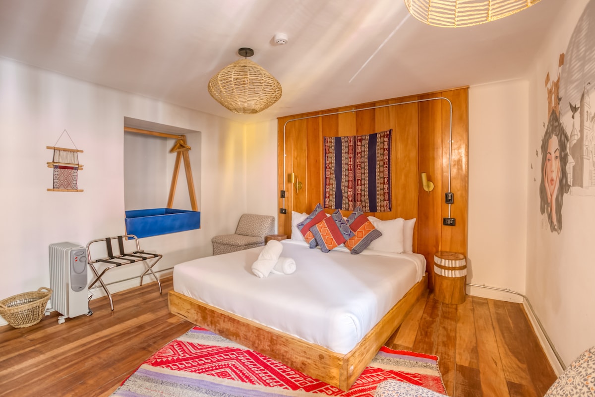 Acogedora, cálida y colorida, esta habitación del segundo piso con vista a la ciudad y acceso directo a la terraza esta llena de inspiración con una mezcla armoniosa de colores y texturas. Cuanta con 1 cama Queen, sala de estar y baño privado con ducha española, toallero caliente, calefacción, minibar con máquina de espresso, tv con Netflix y cable, ropero, caja de seguridad, toallas y frazadas extras, acceso a áreas comunes como terraza, lounge, salón y patio.