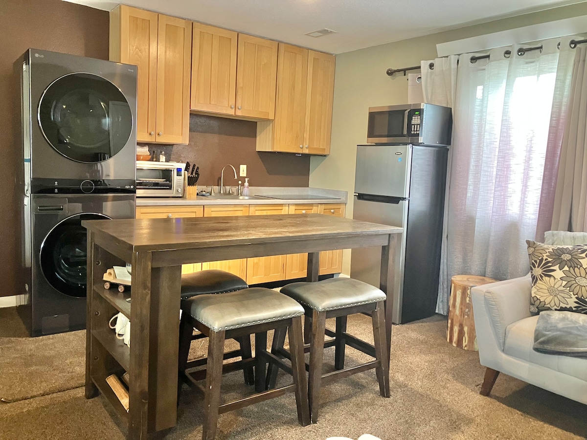 Una entrada privada en el segundo piso para este estudio moderno y luminoso lleno de ventanas y fotografías originales. Puertas francesas a los pies de una cama tamaño king abiertas a la terraza con tu propia fogata privada y parrilla. Una gran sección, red de platos, baño dividido, cocina pequeña con encimera, horno de mostrador, nevera, microondas, platos/utensilios de cocina, cafetera y lavadora/secadora. Estacionamiento privado en la ubicación principal de nuestros Ravens 'Off, a cuatro cuadras a pie de la calle principal. Una habitación sin mascotas, consulta los espacios 9, 10, 11 y 12 para estancias con mascotas.