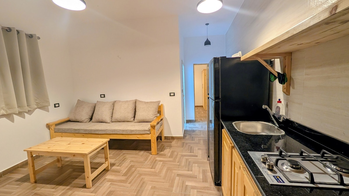 Welcome to your cozy home away from home in Dahab! Located on the first floor, the ‘Sea’-through apartment offers beautiful views of the sea through palm branches and sun rays, just as the picture shows. This spacious 1-bedroom apartment is filled with handmade furniture and accessories that reflect the organic and natural lifestyle we love in Dahab. Situated on the second line directly by the beach, it’s just a 3-minute walk to Assala market and a 10-minute walk to the Lighthouse.