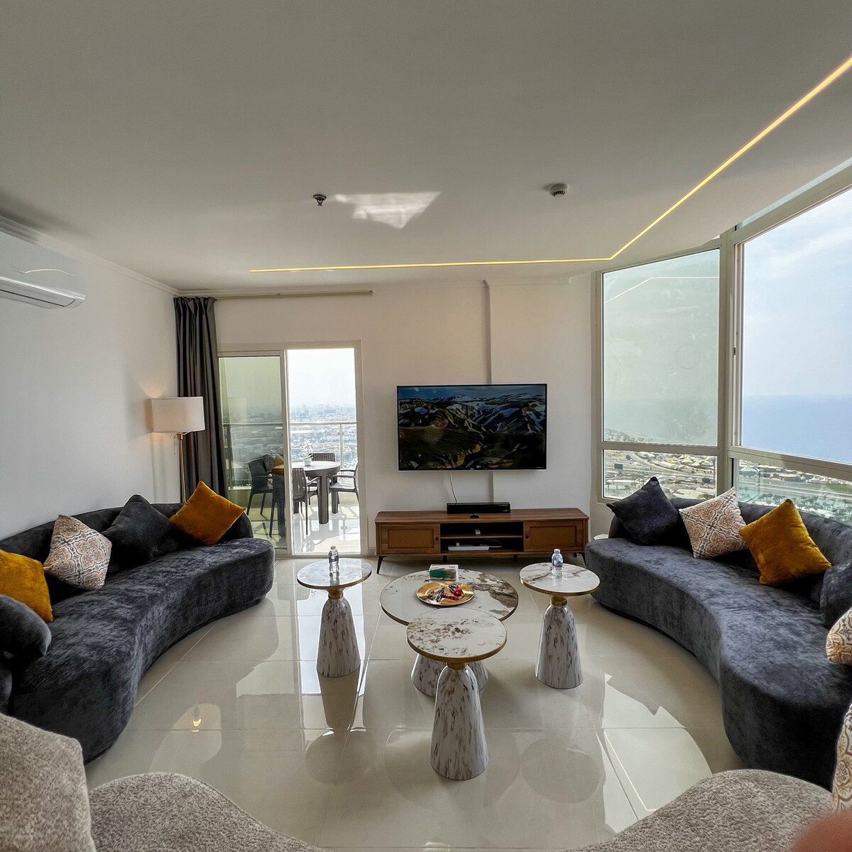 La lujosa suite Moon en la torre DAMAC en Jeddah con un diseño de loft abierto y una rara vista panorámica del mar y la ciudad desde dos ángulos. Ubicado en las mejores zonas de Yeda y directamente en el corazón de la Corniche norte de Yeda, cuenta con un jacuzzi de cascada único con múltiples luces y salidas de agua y un masaje de espalda, con una vista directa al mar. Disfruta de una sesión romántica en el columpio que cuelga en el amplio balcón. La suite tiene un amplio balcón, pantallas inteligentes, una cocina completa, una lavadora, Internet 5G, check-in autónomo y servicio de coordinación de eventos... ¡para una experiencia inolvidable!