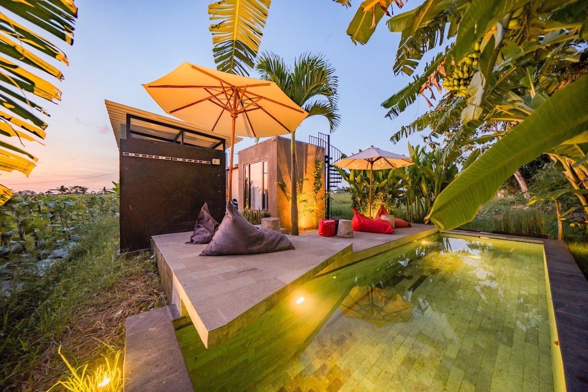 Un estudio único que permite a nuestros huéspedes experimentar una experiencia de vida interior y al aire libre perfecta con vistas a las terrazas de arroz de Bali a través de la fachada completa de la ventana por la mañana, tomar el sol y saltar a la piscina profunda para refrescarse. Asegúrate de no perderte las puestas de sol más hermosas justo encima de las terrazas de arroz que giran el cielo de rojo ardiente. Lo mejor es disfrutar con amigos y bebidas.