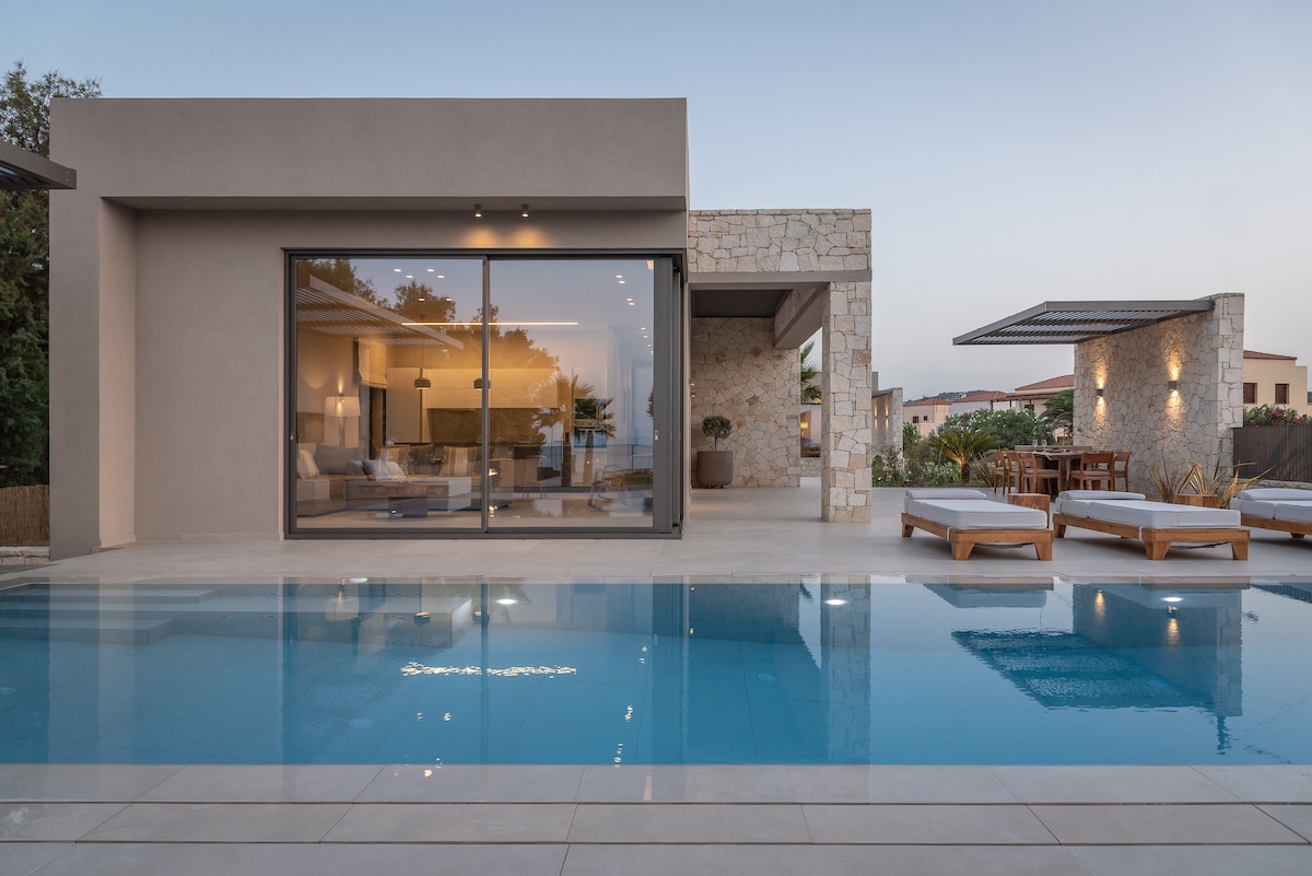 La casa Agave es una nueva residencia de lujo con piscina infinita (estará lista en abril de 2023). Situada en la zona de Stalos en La Canea, al pie de una colina rocosa rodeada de terrenos privados de olivos. La casa está diseñada en estilo minimalista para aquellos que buscan comodidad y placer con impresionantes vistas al mar de Creta, la isla de Τhodorou, la ciudad de La Canea y las montañas Blancas. Todo el equipamiento de la casa se caracteriza por un diseño de alta calidad.