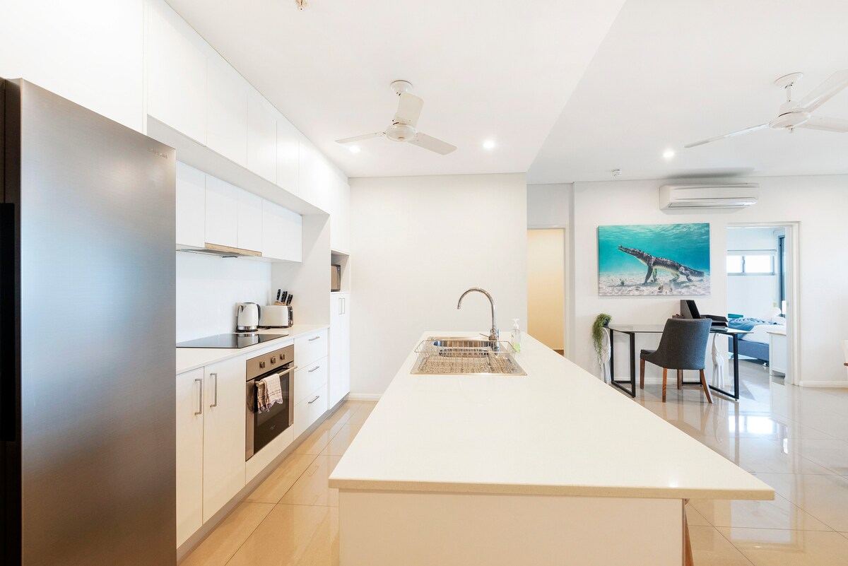 101 The Darwin is a relaxed, effortless Waterfront escape. A fully self‑contained 1‑bedroom apartment for two at the iconic Darwin Waterfront. Sink into easy living with a full kitchen, private laundry, free parking, a dedicated workspace and a spacious verandah. Steps from the sea lagoon, wave pool and vibrant dining precinct, with Stokes Hill Wharf and the city’s best cafés, bars and restaurants just a leisurely stroll away.