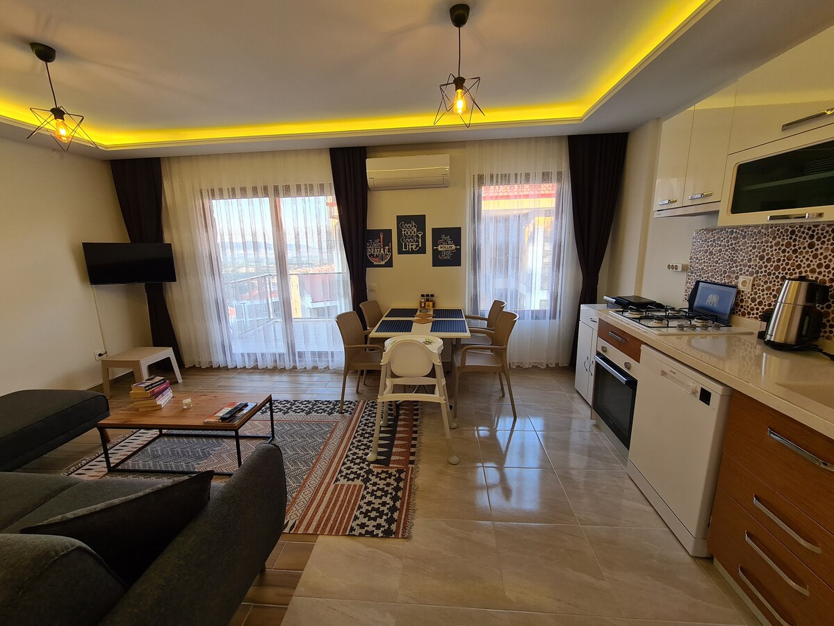 Ubicada en la playa de arena en el centro de Datça, el vecindario de İskele, nuestra casa está ubicada en la playa, el edificio tiene 1 año, está recién amueblado en el interior, tiene su propia entrada independiente y está en el segundo piso de una casa de dos pisos. No hay ningún otro apartamento en el mismo piso del edificio, es muy agradable ver el amanecer y la luna llena desde el balcón. La playa frente a ti está limpia y puedes bañarte cómodamente en el mar. Hay un centro comercial en la calle principal, a solo 100 metros de distancia para ir de compras, y dos estacionamientos abiertos gratuitos muy cerca (100 m).