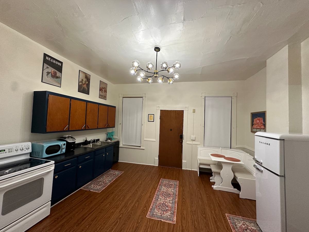 Acogedor apartamento en la planta superior, a 1/2 milla del pueblo de East Davenport. Este es un lugar pequeño, pero perfecto para pasar un fin de semana o un viaje de trabajo semanal. Calefacción radiante y una vista preciosa del barrio y, a veces, del río. ¡Roku gratis y Disney+! (sin canales locales) Wifi Utensilios de cocina, utensilios y café y té de cortesía con tazas para llevar para las mañanas tempranas. LGBTQ+ amigable.🏳️🌈 Propietario ocupado con niños pequeños ruidosos en el resto de la casa. No hay espacio compartido, compartimos paredes.
