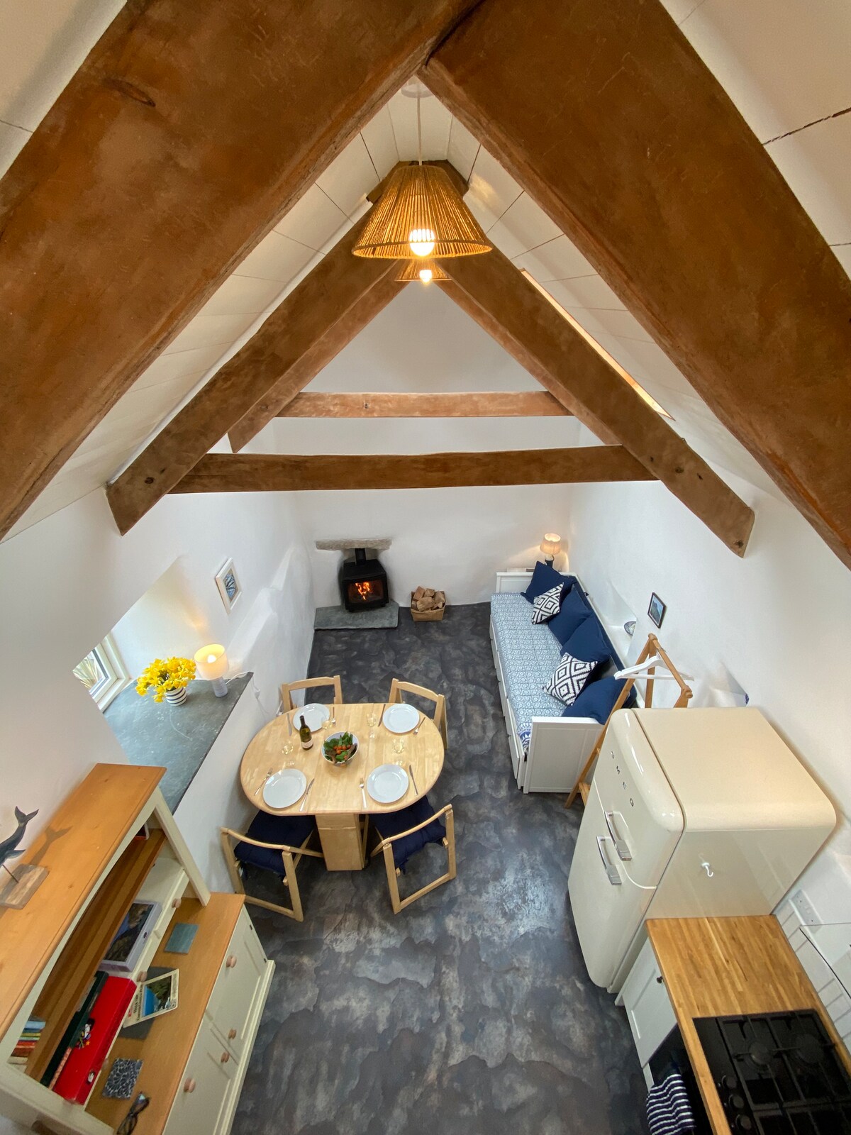 Un espacio tranquilo y profundamente lujoso para recargar energías y reconectar. The Shippon es un establo de vacas meticulosamente convertido con suelos de hormigón pulido y radiante, paredes de color verde oscuro suavemente curvadas, cocina hecha a mano, rincones de lectura cálidamente iluminados y materiales naturales. Mantas de lana, sofá de plumas, estufa de leña escandinava antigua, cama tamaño king con sábanas y edredón franceses, ducha de cascada y las toallas más suaves. Nuestra tranquila aldea de Devon solo está iluminada por las estrellas por la noche. Es posible que duermas mejor de lo que has dormido en años.