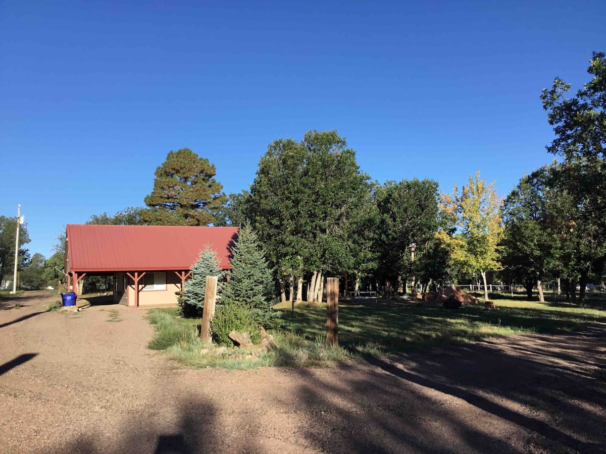 Alójate en una cabaña rural y acogedora a solo 30 minutos al sur de la Ruta 66. El Bosque Petrificado, así como los lagos locales, los arroyos y las Montañas Blancas están a poca distancia en coche. Situada entre pinos, esta casa de huéspedes privada de un solo nivel para 2 personas (más 1 bebé) ofrece comodidad, privacidad y un sabor a naturaleza. Tu perro de 30 libras o menos y bien educado es bienvenido y disfrutará de un patio vallado. Se proporcionan microondas, nevera, Keurig, horno tostador y plancha al aire libre para tu comodidad.