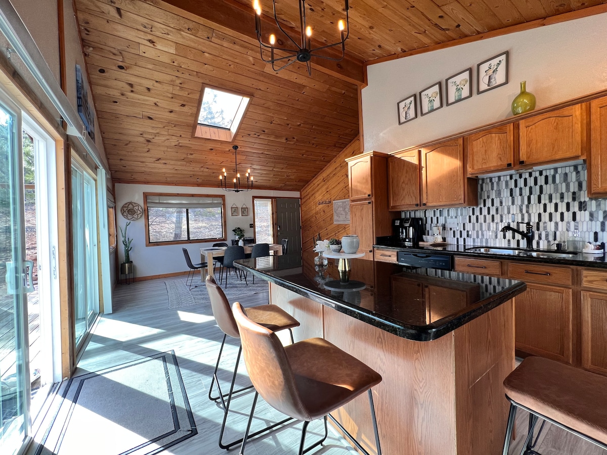 ¡Disfruta de nuestra escapada de lujo en cabaña en los pinos! Disfruta de las impresionantes vistas al prado mientras te alojas cerca de la ciudad. Nuestra moderna cabaña/villa es ideal para una familia que busca un viaje tranquilo a las montañas. Cama tamaño king, tamaño queen (sofá cama), baño grande con ducha y una cocina de tamaño completo. ¡Hay mucho que hacer a poca distancia a pie, como senderismo, golf con disco volador y pesca! Los restaurantes populares están a la vuelta de la esquina o haz un pedido y disfruta de tu elección de entretenimiento en dos sma
