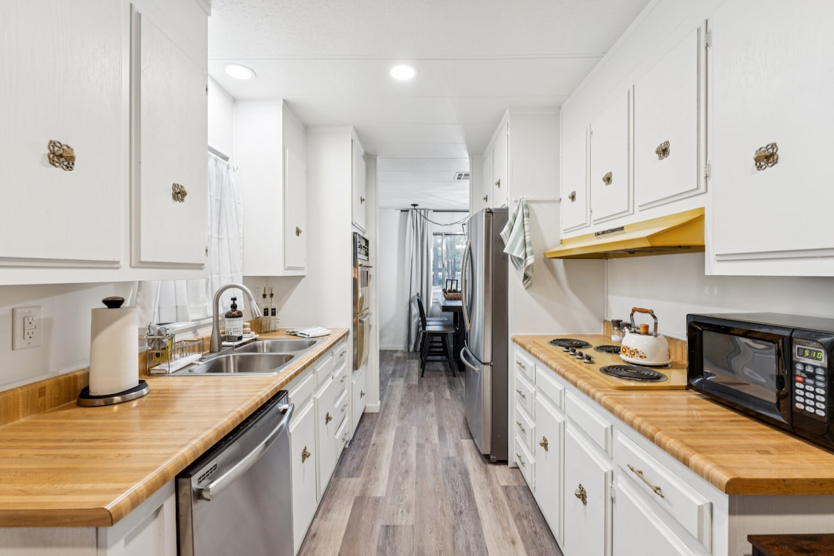 Bienvenido a The Bitty Bungalow, un encantador pequeño estudio de invitados, perfecto para aquellos que buscan simplicidad acogedora con todas las comodidades de un hogar. Cuenta con una mini cocina bien equipada, un baño rediseñado de lujo y una mini lavadora y secadora. El antiguo escritorio enrollable de mi abuela y las pinturas al óleo originales de mi abuelo completan el aspecto rústico de la casa. Aunque es ideal para una escapada en solitario o en pareja, The Bitty Bungalow tiene capacidad para 6 huéspedes, lo que permite a las familias o grupos disfrutar de un modesto refugio en los pinos.
