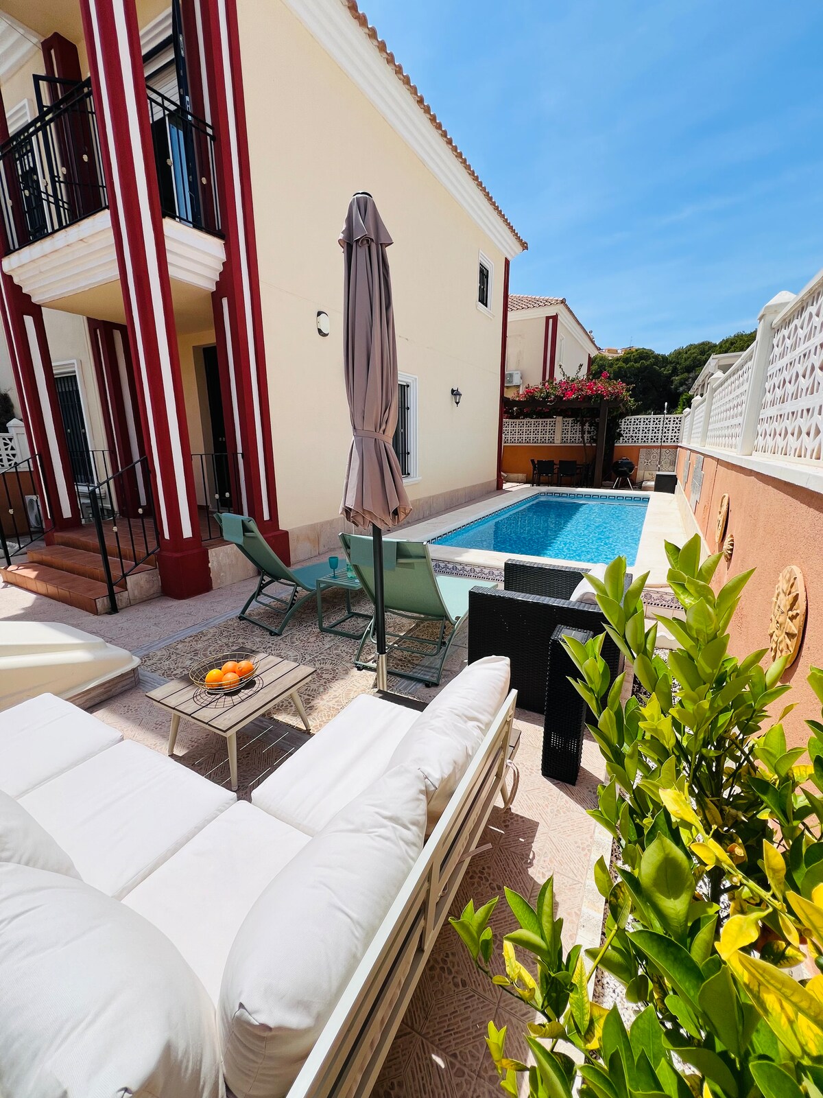 Sumergete en la Serena del Mar, una lujosa y muy bien equipada Villa con piscina privada + Yacuzzi, mucho espacio exterior y un diseño moderno y colorido. La vivienda destaca por su amplitud, claridad y comodidad. Es perfecta para familias o parejas que quieren disfrutar de un espacio limpio, pero calido y espacioso pero acogedor. Ven a esta casa que podria ser tu hogar temporal, cerca de la playa, el centro y a solo 20 metros de un Mercadona. La comodidad en su mayor expresion