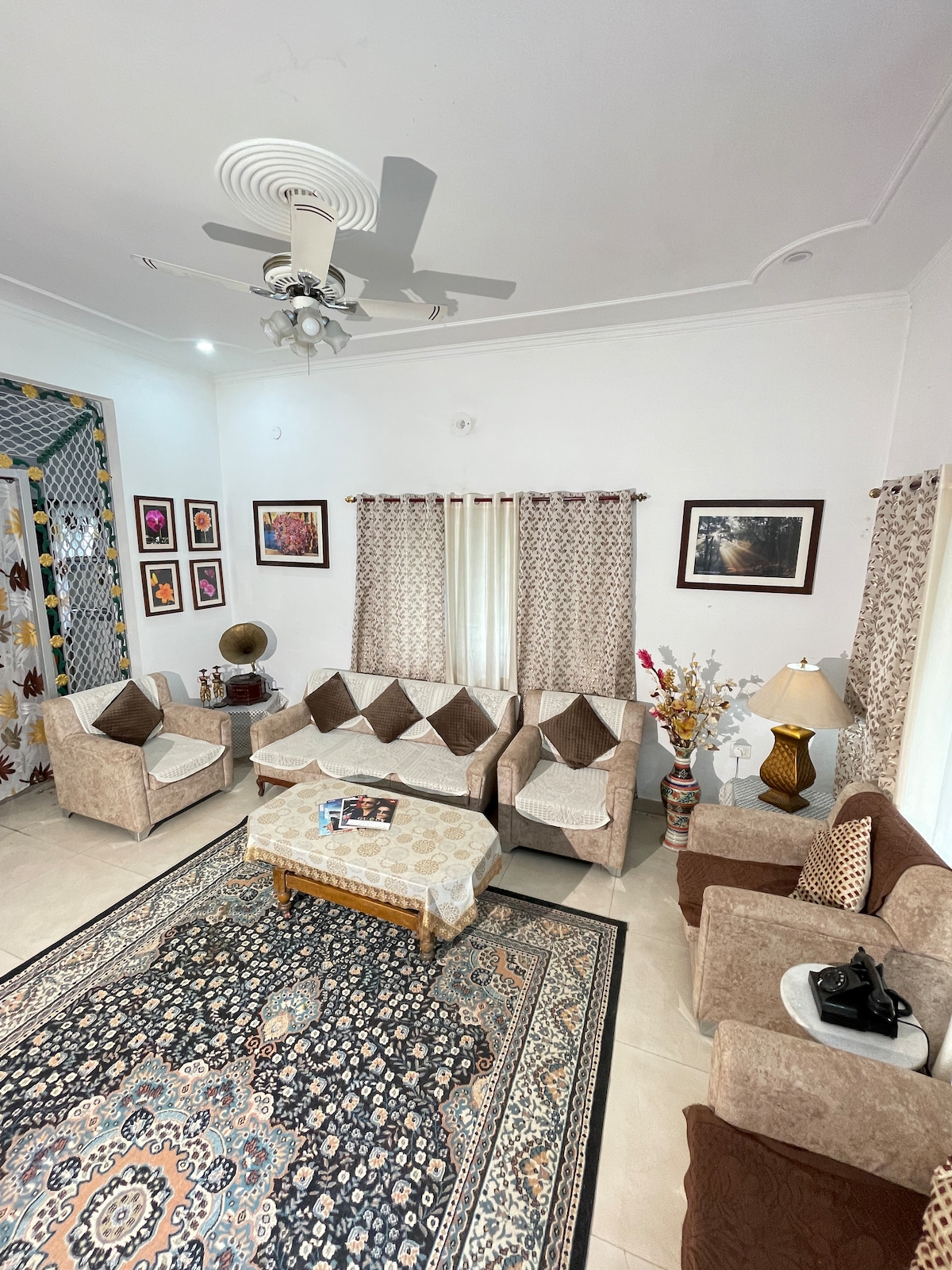 Una acogedora casa de 2BHK con una vista sacada de una película: mira las puestas de sol, los arco iris y el Himalaya desde tu balcón con vistas a un campo de golf de 9 hoyos. Perfecto para parejas y familias, cuenta con un espacio de trabajo designado con sillas ergonómicas, muebles cuidadosamente seleccionados y arte. La sala de estar está hecha para noches de Netflix con un sistema de sonido, wifi de alta velocidad y una cocina totalmente equipada para la comodidad del hogar. A 15 minutos de la carretera de Rajpur.