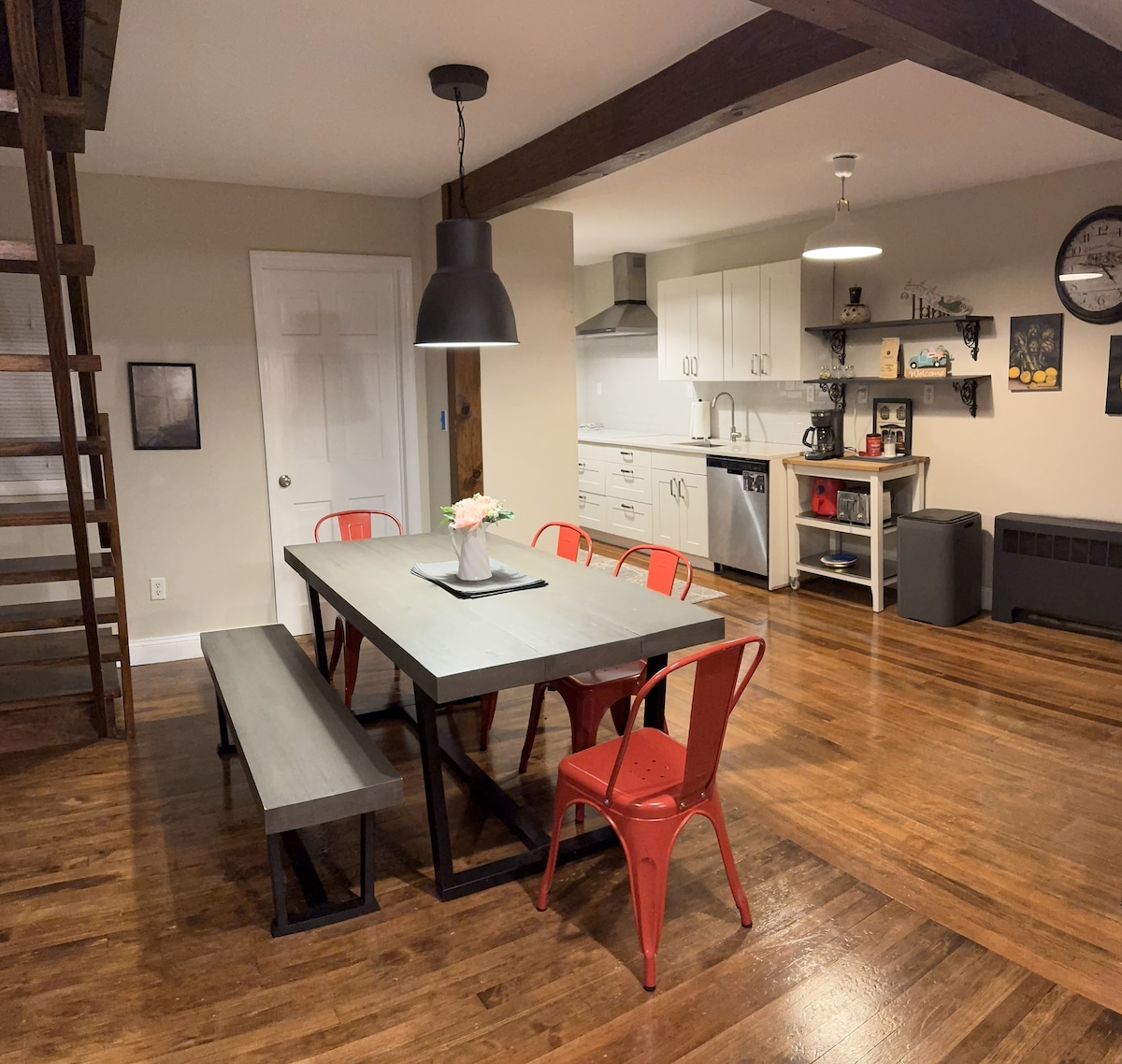 Luminoso y acogedor apartamento en el corazón de Margaretville Village cuenta con una cama tamaño queen en el acogedor loft para dormir, el sofá se abre a un tamaño doble también. Los techos abovedados dan al espacio una sensación espaciosa, puedes cocinar y ver tus canales de transmisión favoritos con wifi, o salir a cenar. Estamos a poca distancia a pie de todos los servicios, senderismo, pesca, antigüedades, tiendas, cafeterías y mucho más. Estamos cerca de esquí, pesca, senderismo, lugares para bodas y todo lo que Catskills tiene para ofrecer.