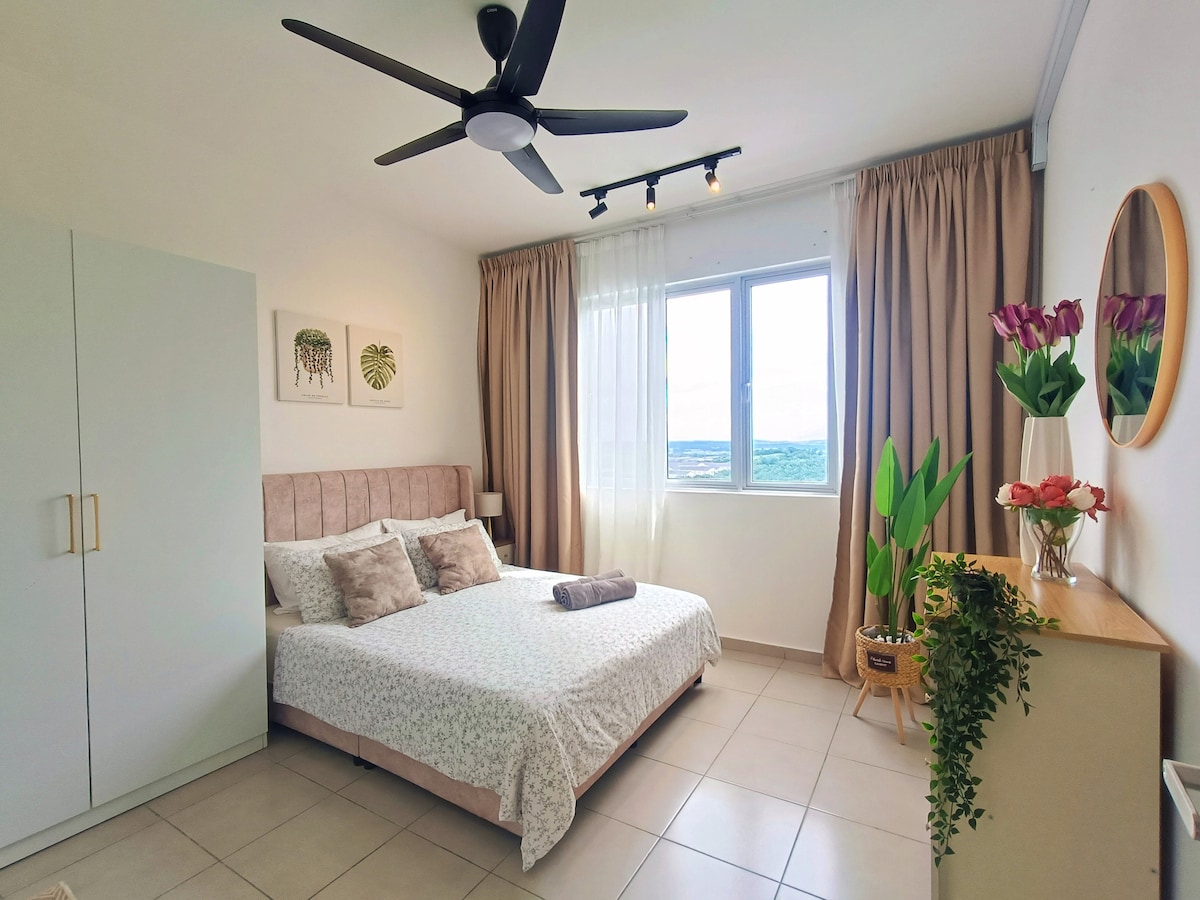 Apartamento de 2 dormitorios equipado con 3 aires acondicionados, internet de alta velocidad y el más reciente es un purificador de agua ideal para alojar a 4 personas. Sereno entorno en planta alta, completo con piscina y gimnasio. Ubicado cerca del aeropuerto KLIA, Malasia. Disfruta de una estancia sin estrés con llegada autónoma las 24 horas, convenientemente ubicado a solo 15 minutos del aeropuerto internacional T1 o T2. Tanto si tienes una salida temprano por la mañana como si llegas tarde, ahorra tiempo y relájate antes de tu vuelo. Grab está disponible las 24 horas.